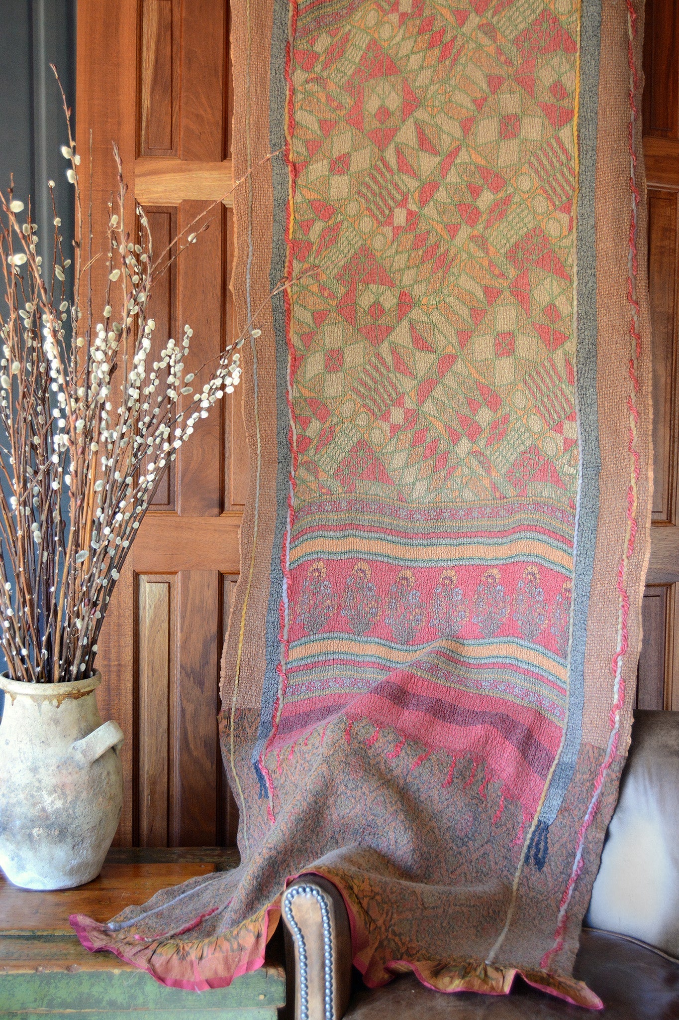 I can’t imagine the time and skill it took to create these. Not one detail was overlooked. A beautiful mixture of color, the varying textures, the felting, the intricate stitching, and the wonderful feeling of being wrapped in something so natural and warm. Everything! Perfection.