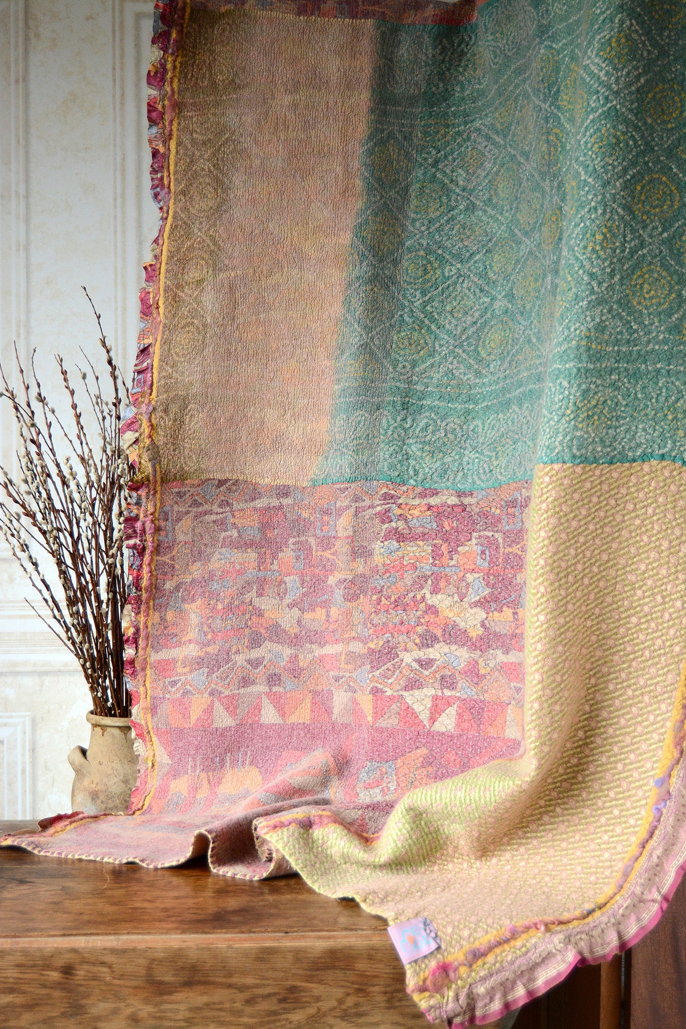 Cosset & Lock Silk and Wool Textiles are made using a unique process of felting to marry together the strength, beauty, and qualities of silk and wool natural fibers. Because I use repurposed sarees, and due to the handmade process, every blanket has unique characteristics and distinctive occurrences.