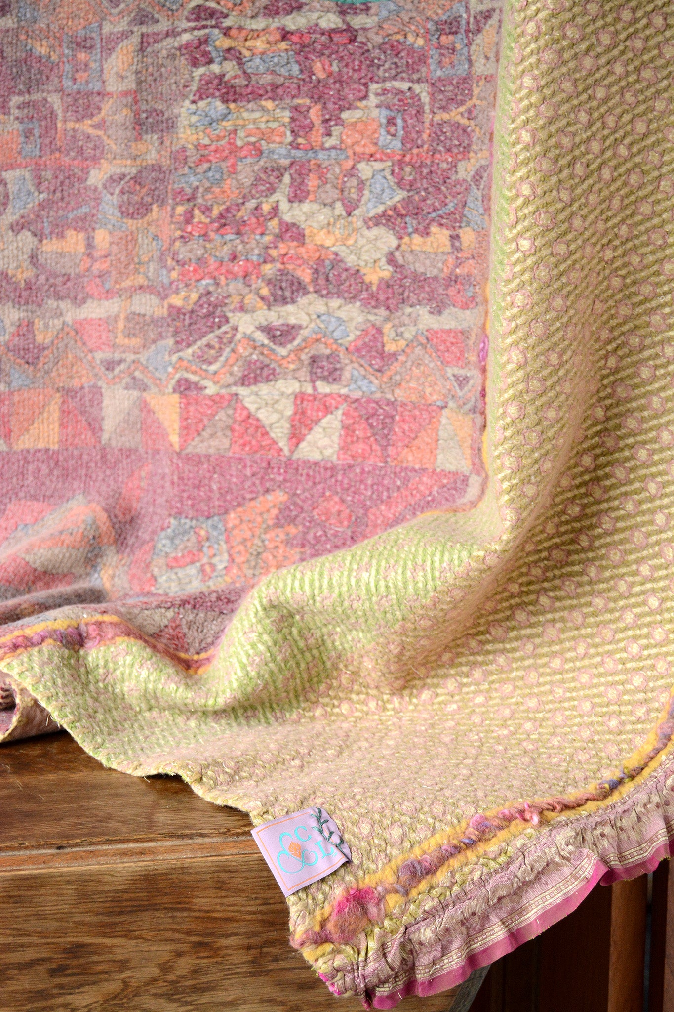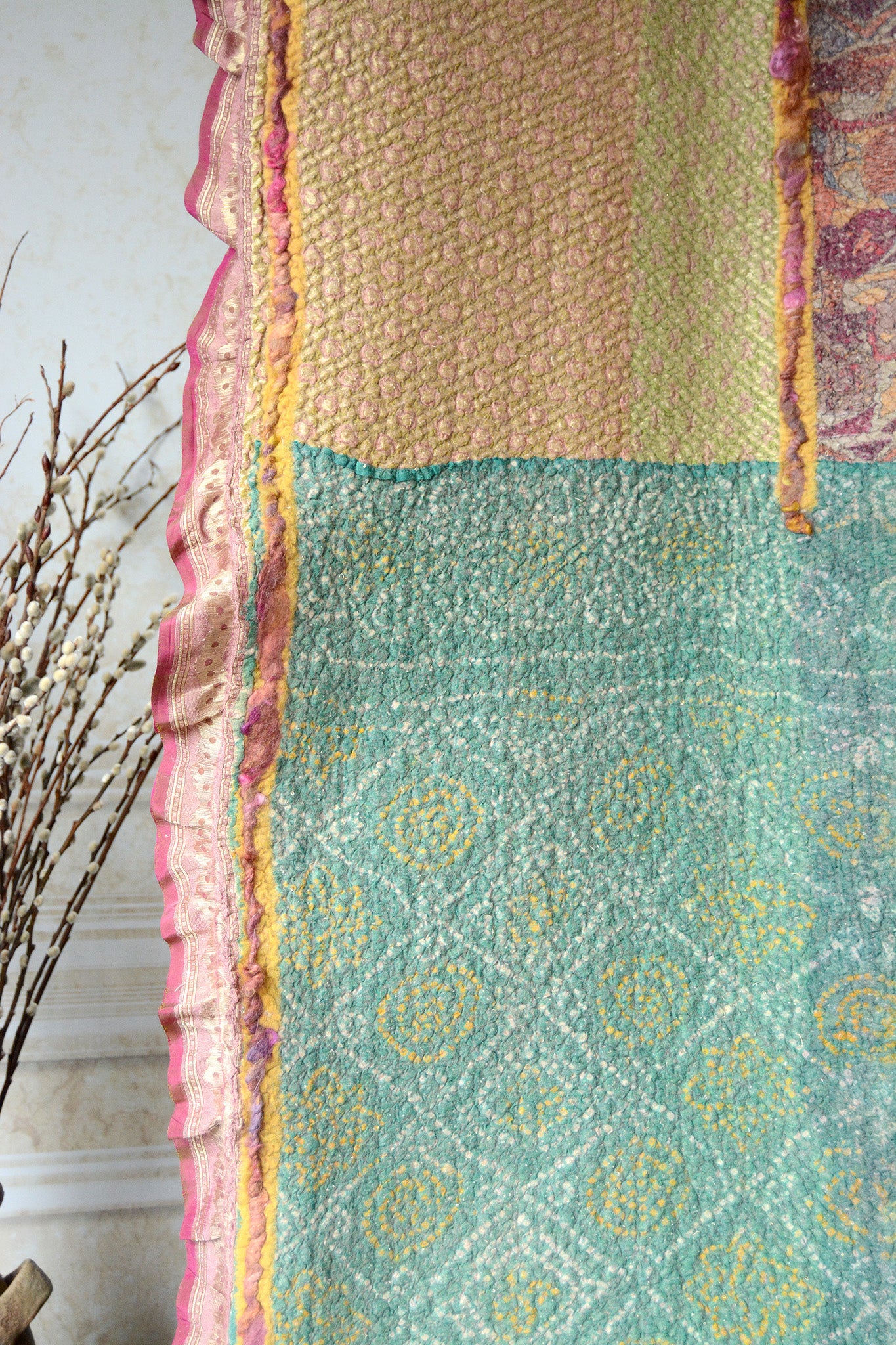 The Page of Wands throw is made on soft pink merino wool with heavy brocade sarees. It is further embellished with woven merino ribbon and handspun locks.