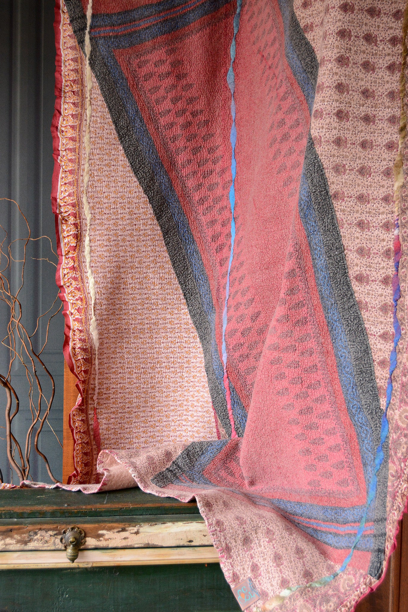 Cosset & Lock Silk and Wool Textiles are made using a unique process of felting to marry together the strength, beauty, and qualities of silk and wool natural fibers. Because I use repurposed sarees, and due to the handmade process, every blanket has unique characteristics and distinctive occurrences.