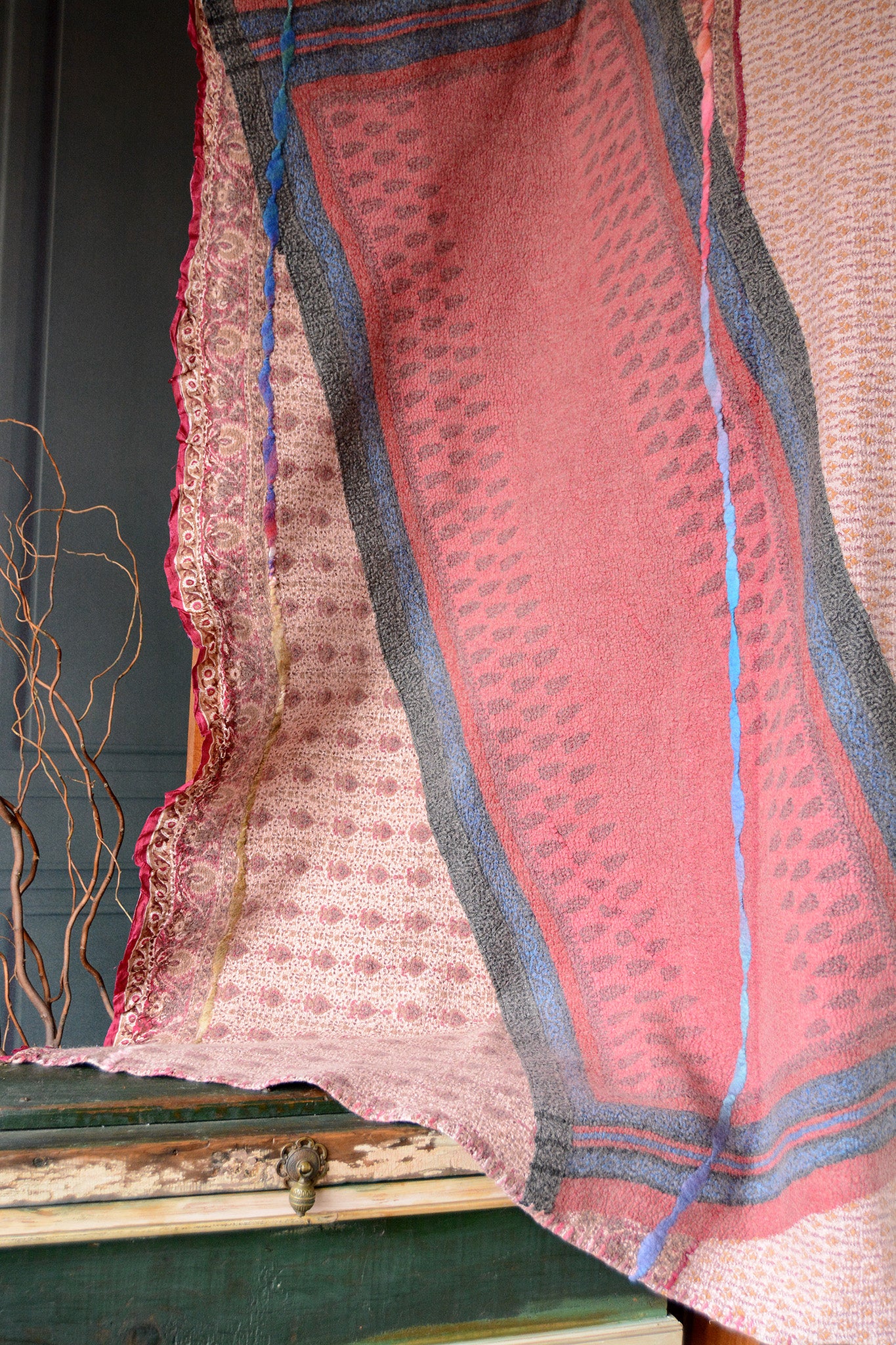 Flourish is made with pure silk printed sarees on a muted light pink merino wool backing. A colorful woven dupatta and handspun thick and thin merino yarn further embellish this cozy throw.