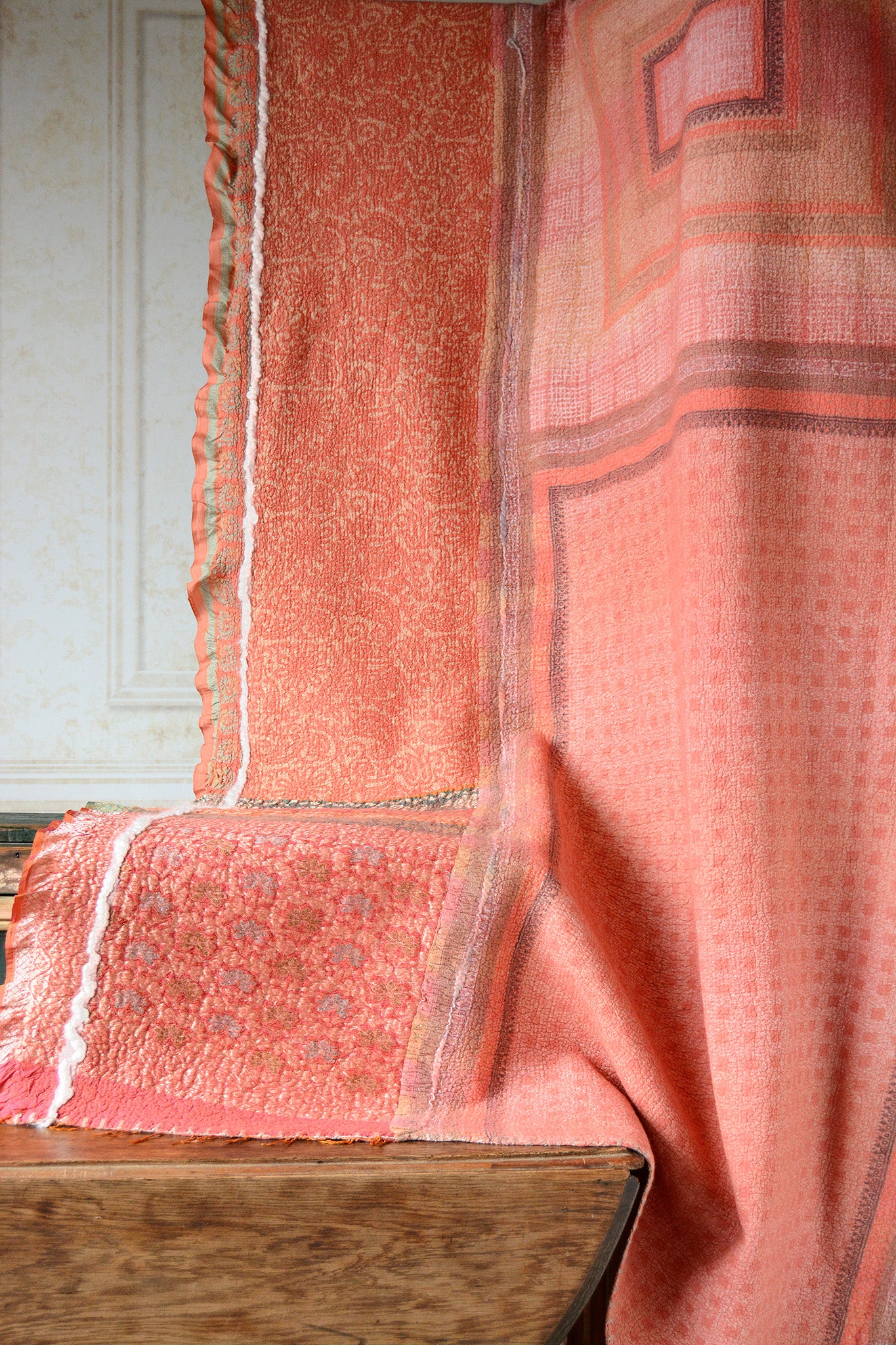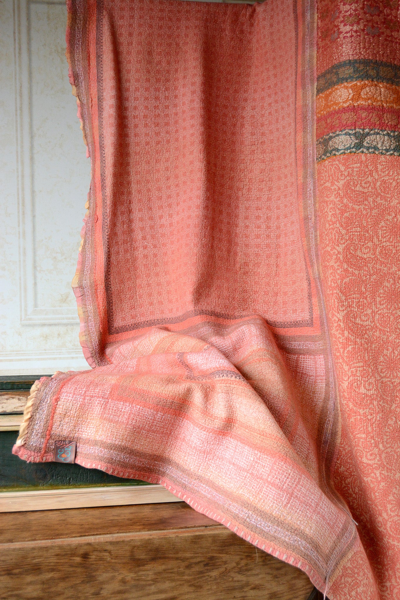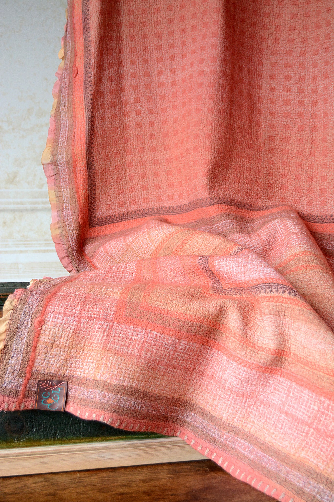 Geode Throw is made with pure silk sarees on an in-house created, coral, merino wool and silk prefelt. The resulting throw is weighty and soft with handspun beehive yarn.