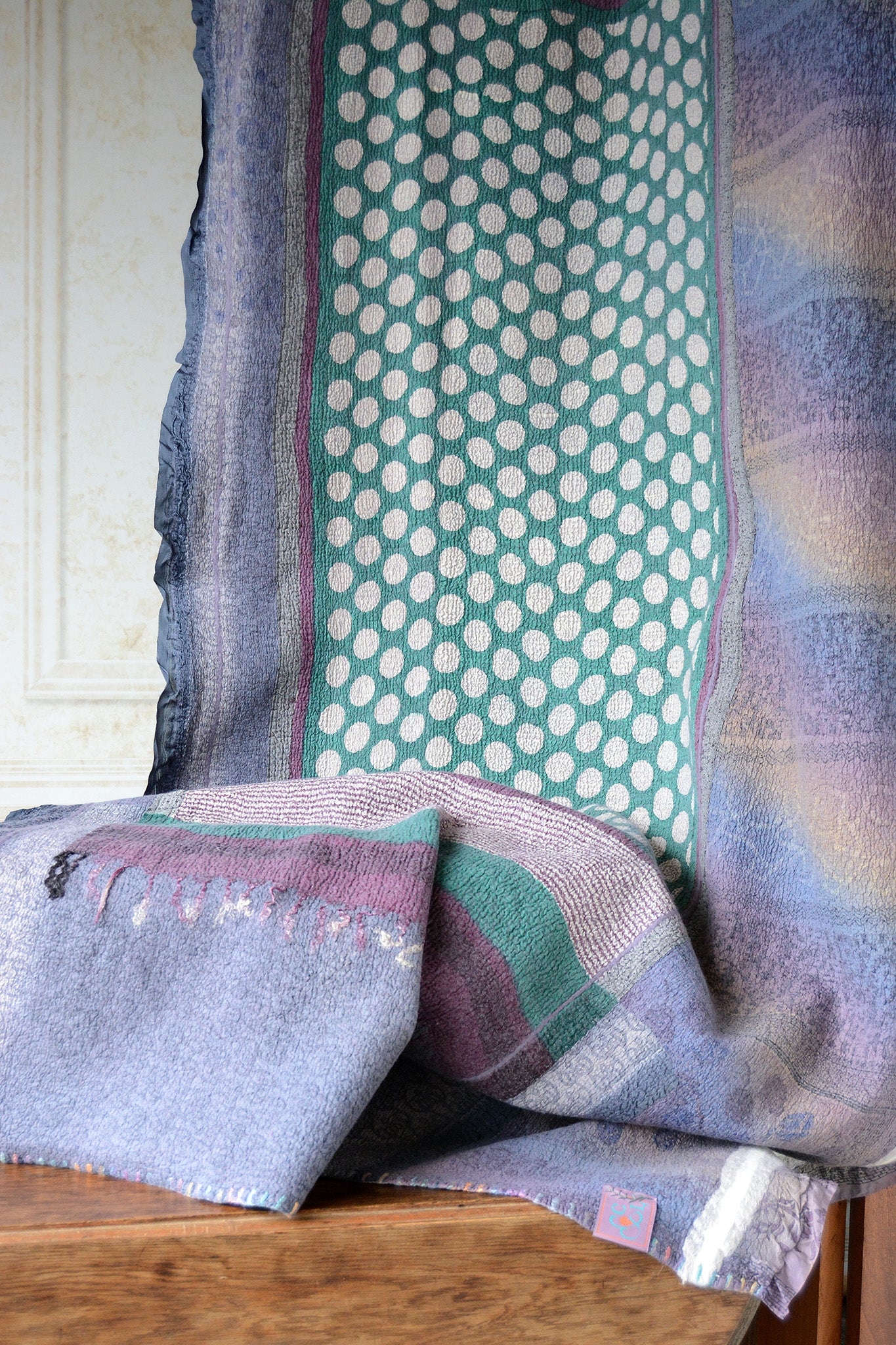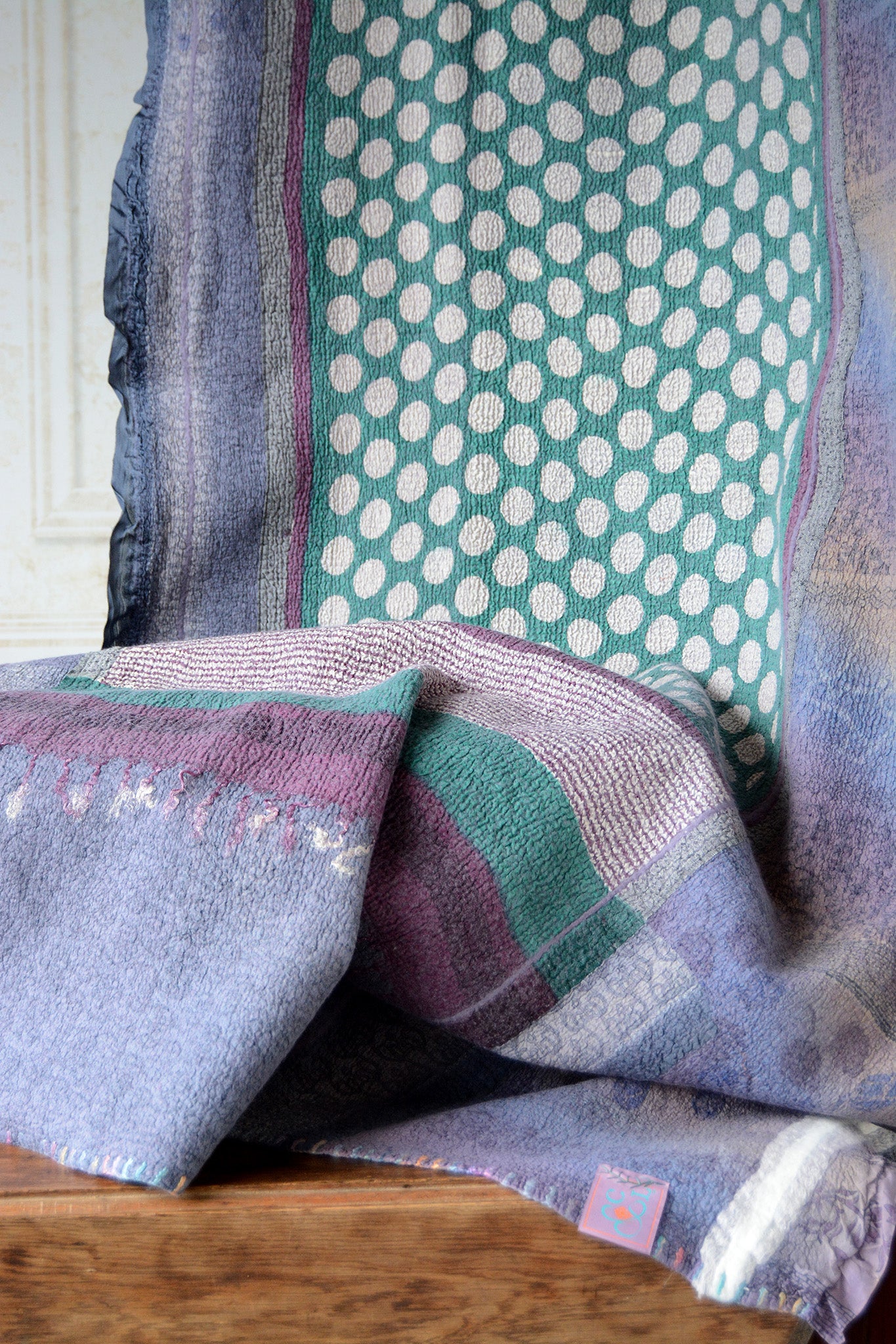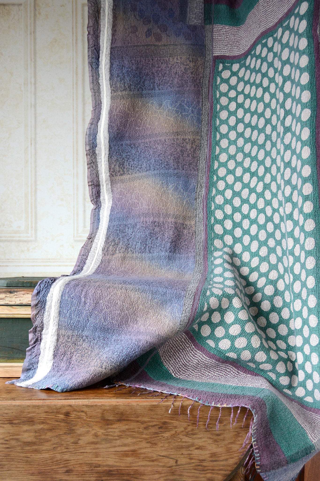 Abound was named for its abundant color, design, and texture. Pure silk sarees are layered on dusty lilac merino wool backing with a woven dupatta added. Single ply superfine merino yarn and a woven mohair yarn further accent the blanket.