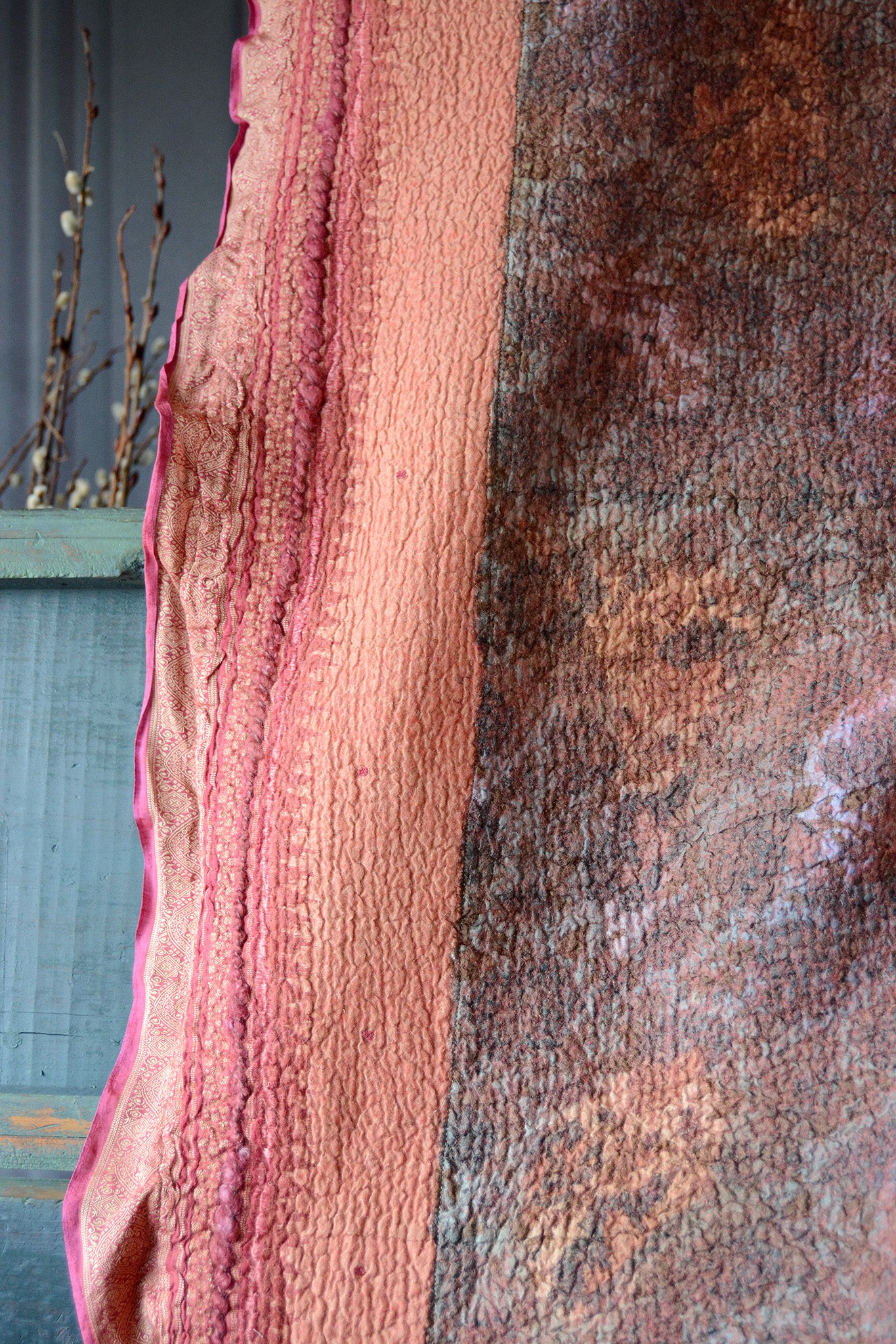 Wanderlust is made with woven Ikat sarees and pure silk printed saree on a house made coral colored merino/silk prefelt. Additions of handspun locks add a textural pop. This blanket is on the heavier side of our line.