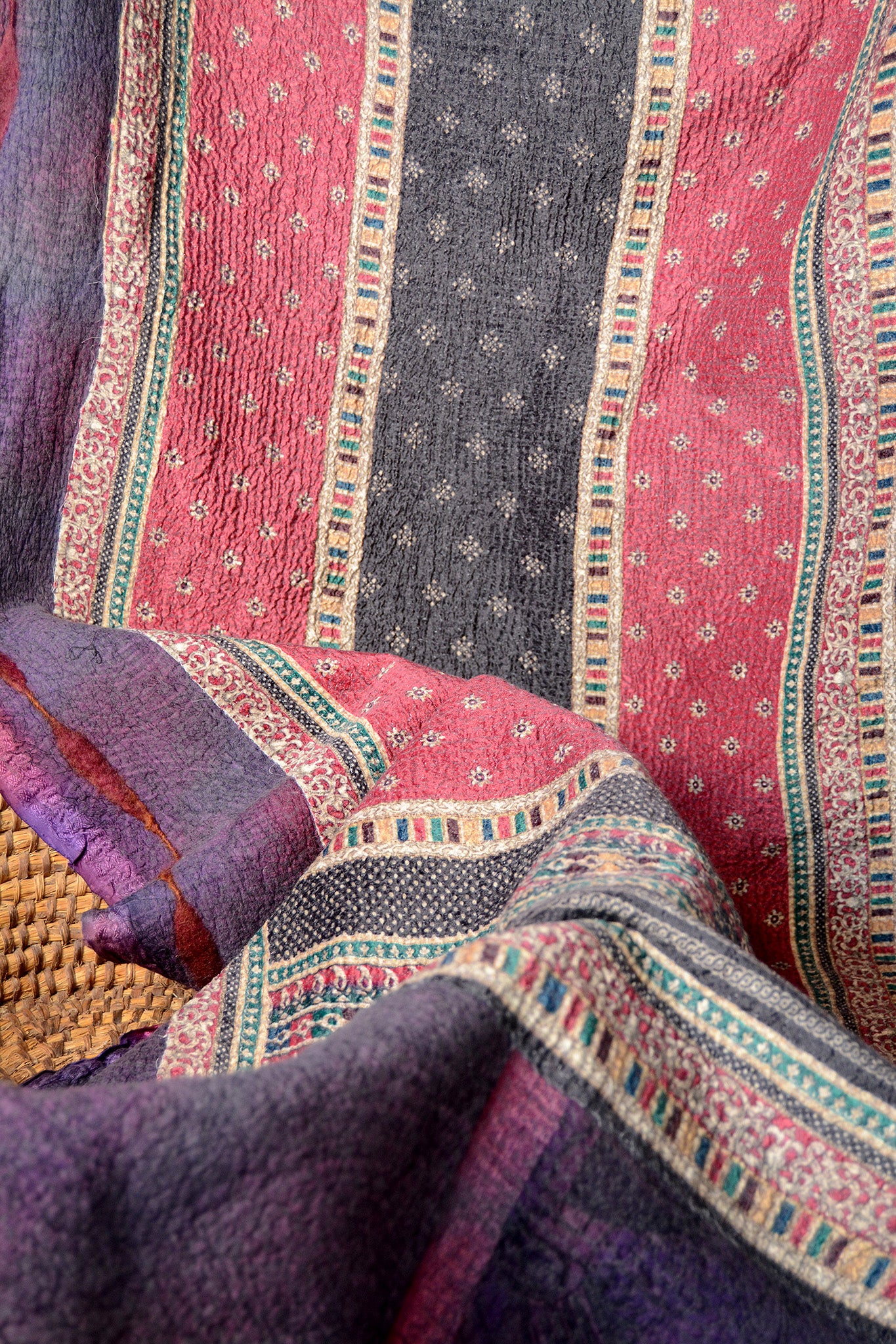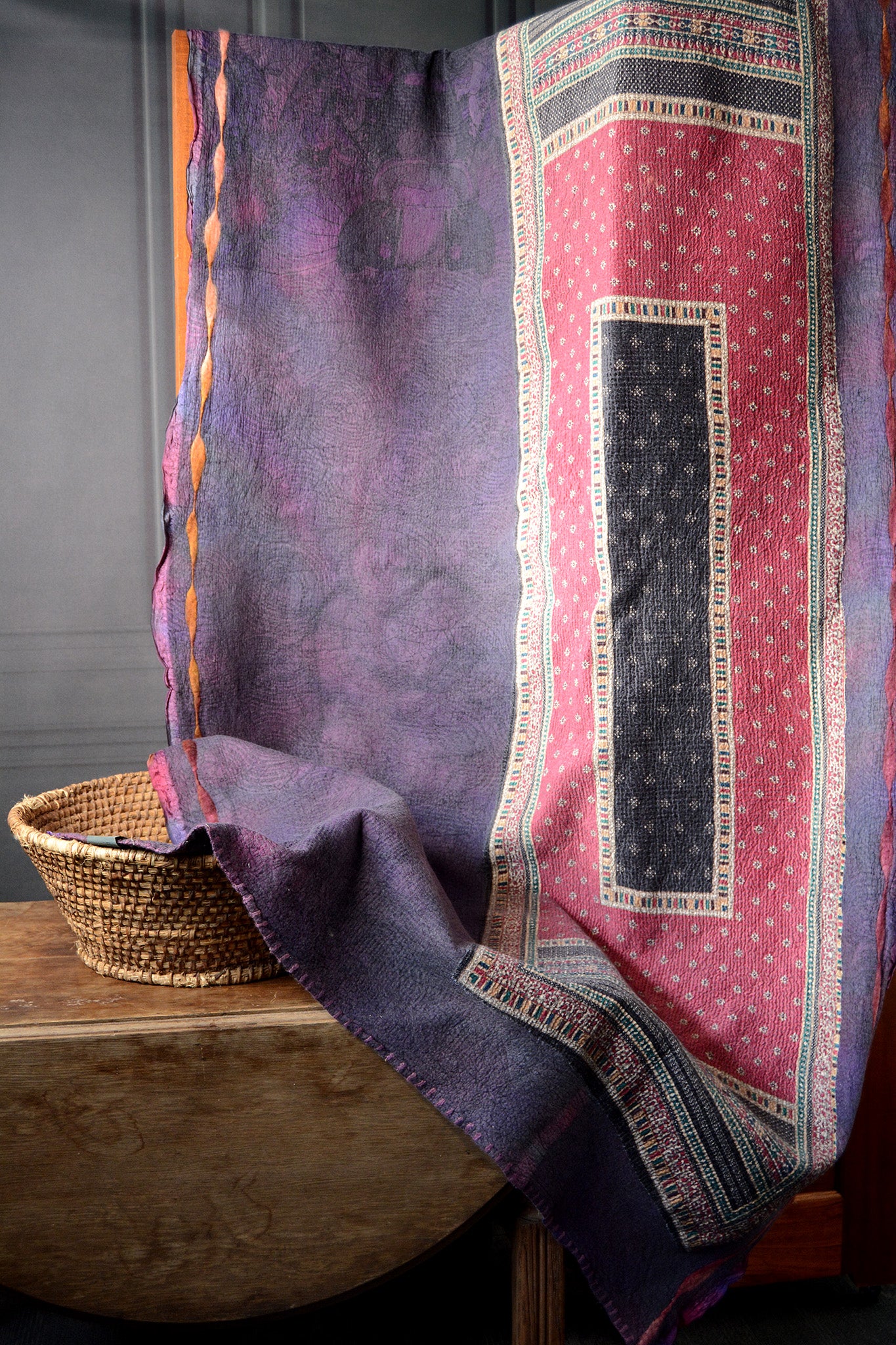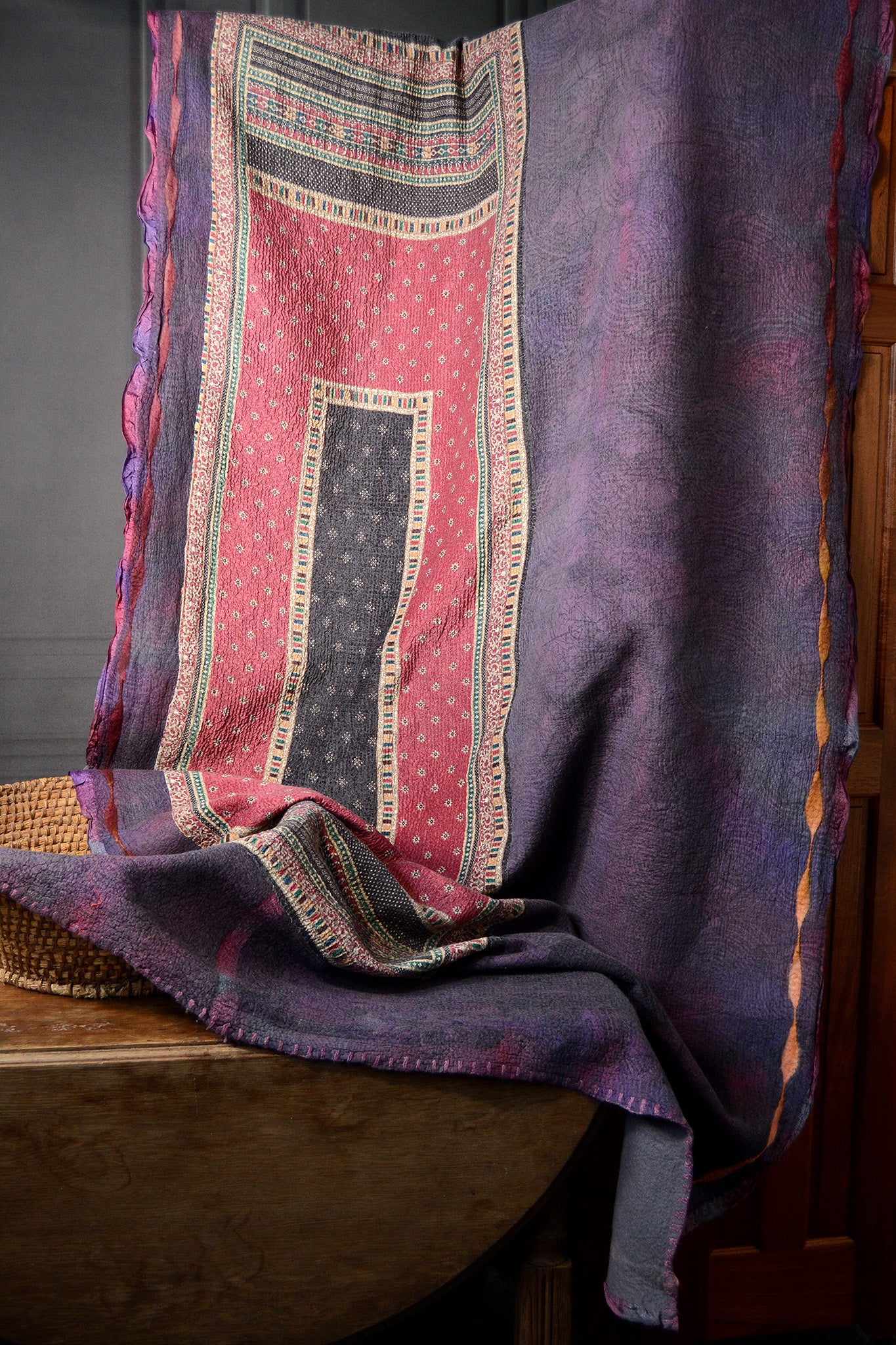 Cosset & Lock Silk and Wool Textiles are made using a unique process of felting to marry together the strength, beauty, and qualities of silk and wool natural fibers. Because I use repurposed sarees, and due to the handmade process, every blanket has unique characteristics and distinctive occurrences.