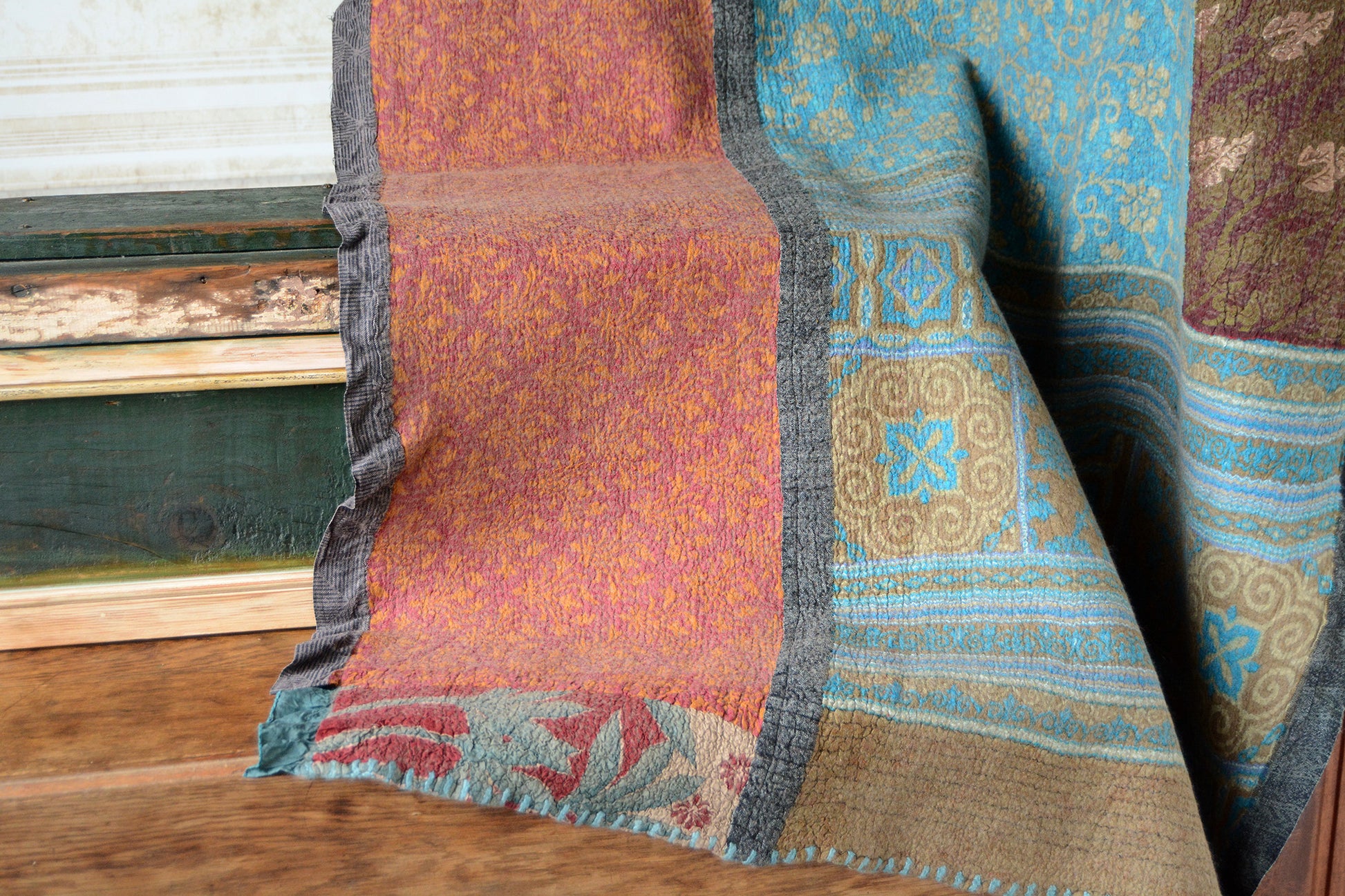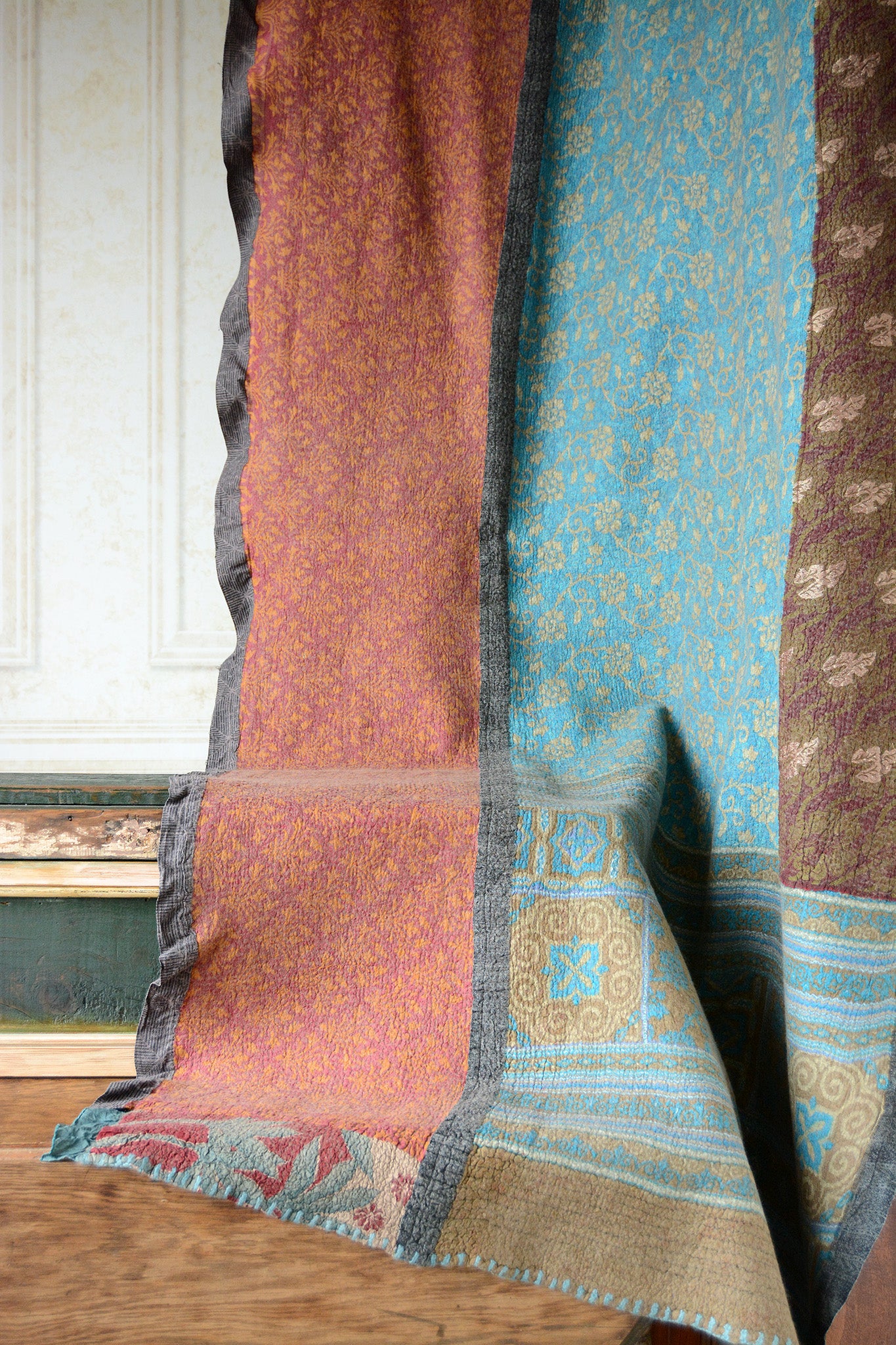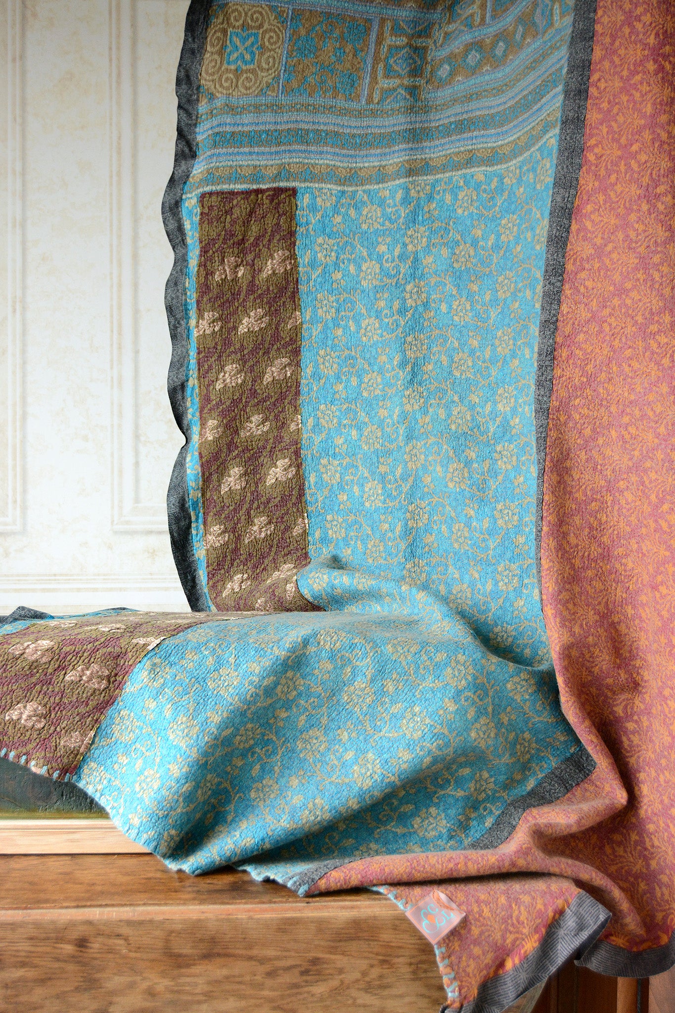 You will not want to let the Clutch throw go! Backed by earth toned superfine merino wool, Clutch is made with drapey and warm woven woolen sarees.