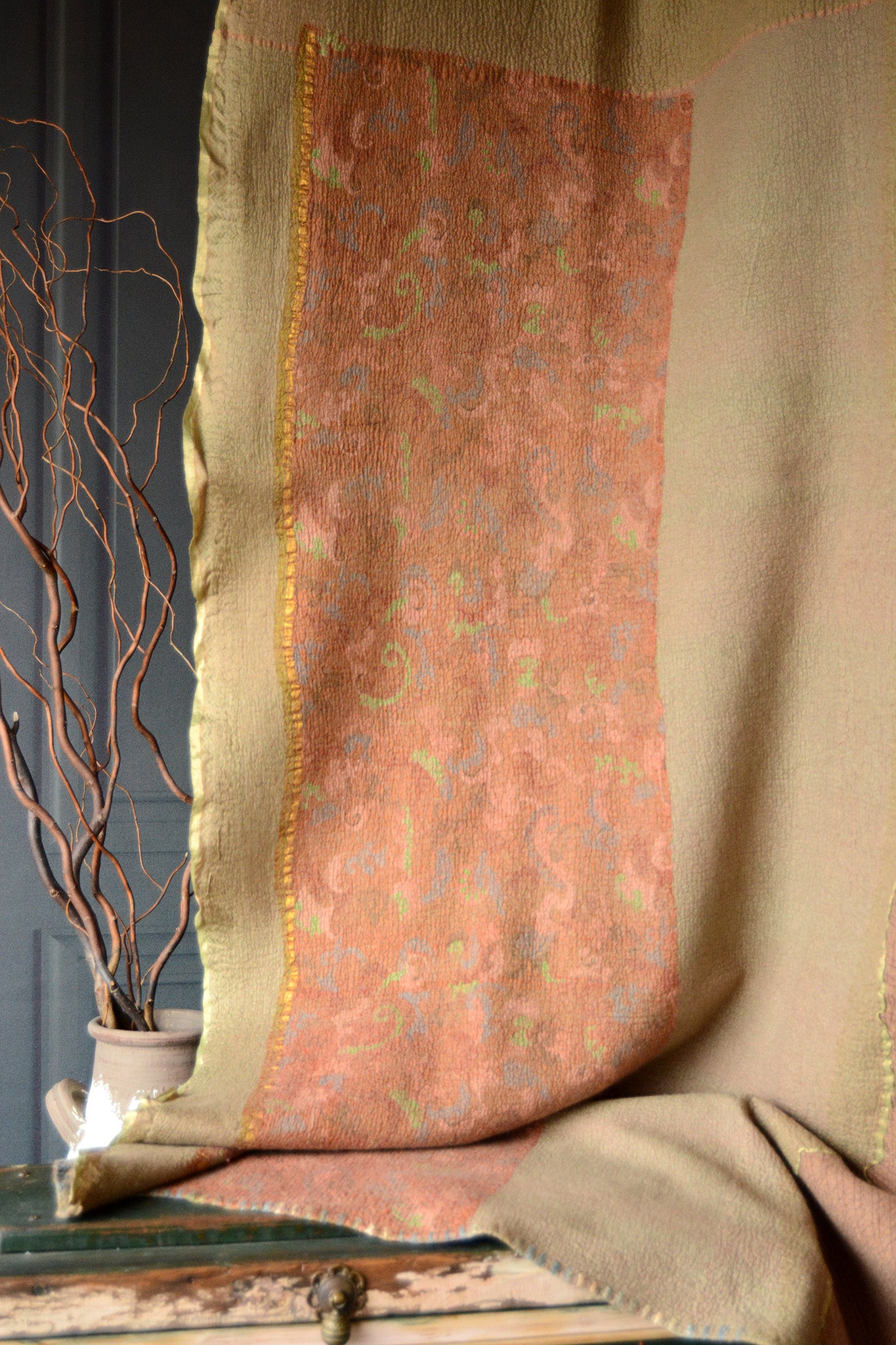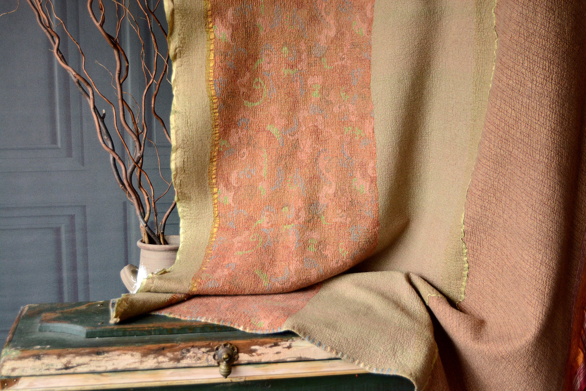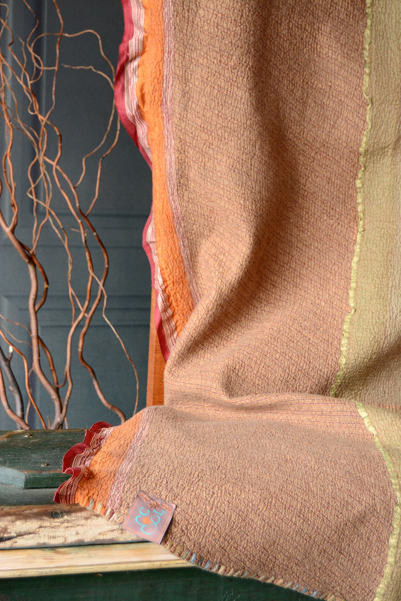 Cosset & Lock Silk and Wool Textiles are made using a unique process of felting to marry together the strength, beauty, and qualities of silk and wool natural fibers. Because I use repurposed sarees, and due to the handmade process, every blanket has unique characteristics and distinctive occurrences.
