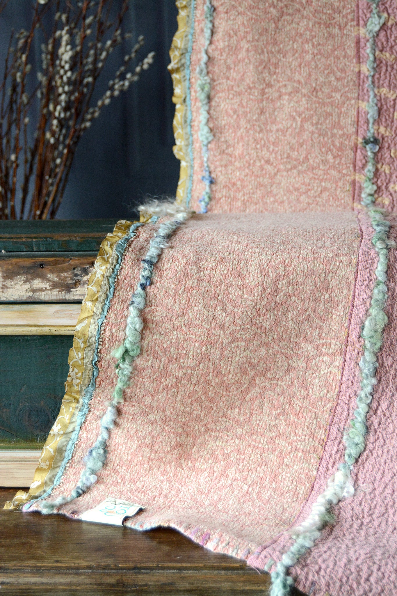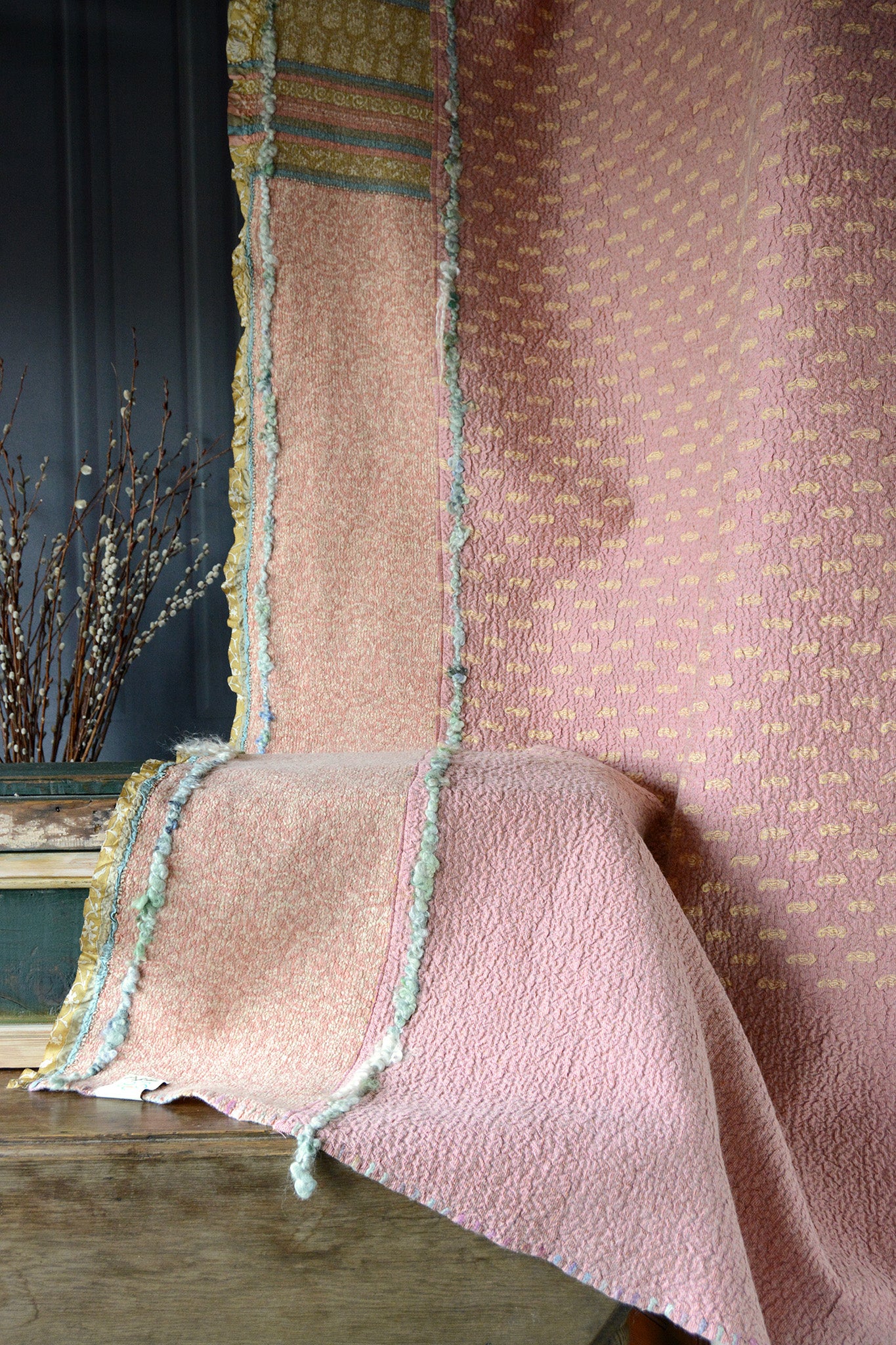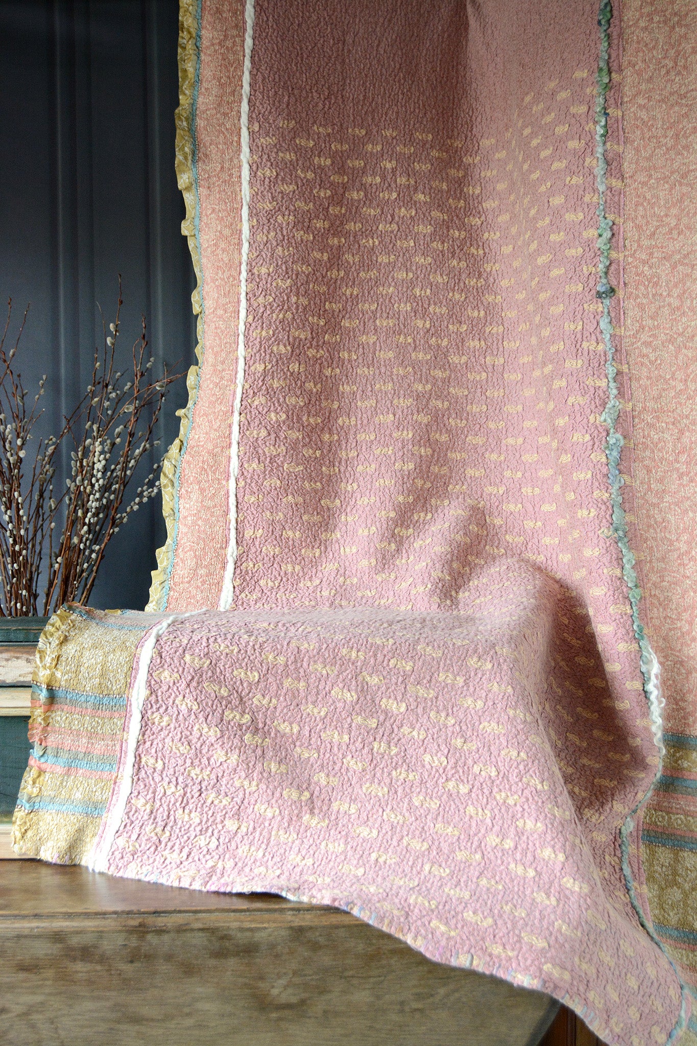 Cosset & Lock Silk and Wool Textiles are made using a unique process of felting to marry together the strength, beauty, and qualities of silk and wool natural fibers. Because I use repurposed sarees, and due to the handmade process, every blanket has unique characteristics and distinctive occurrences.