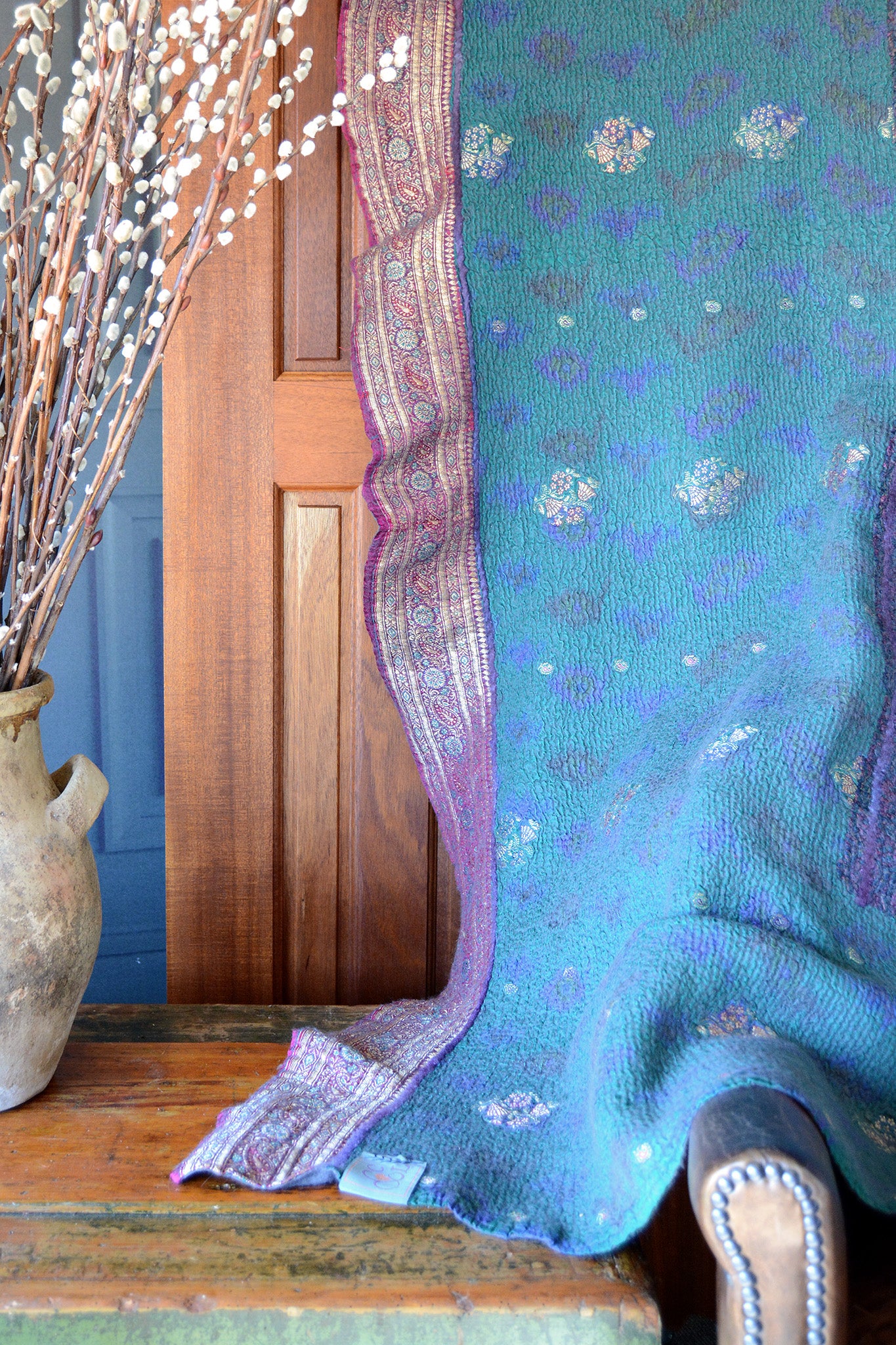 Gemini is made with a heavy banarasi woven saree giving it a weighty drape. The backing wool is dark gray merino and hand dyed yarn runs the length.