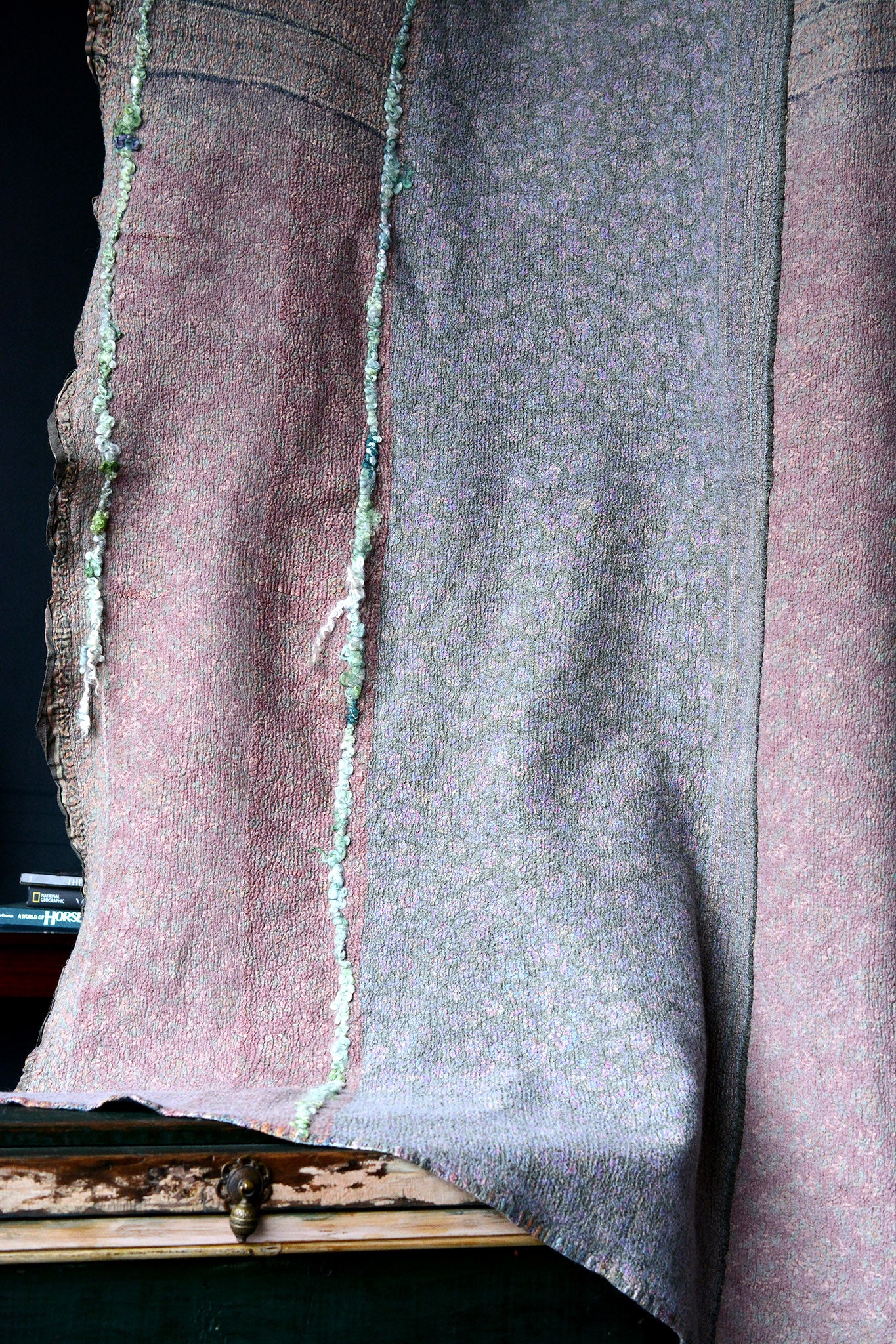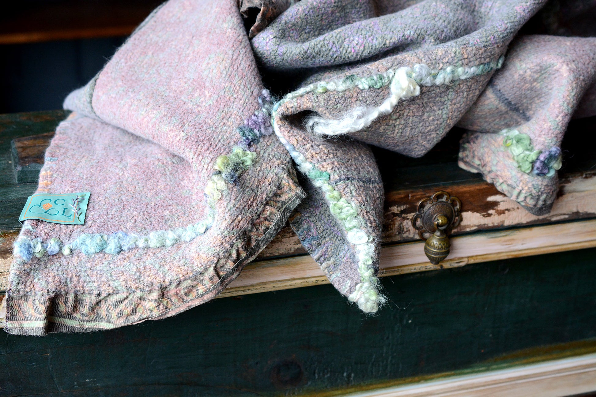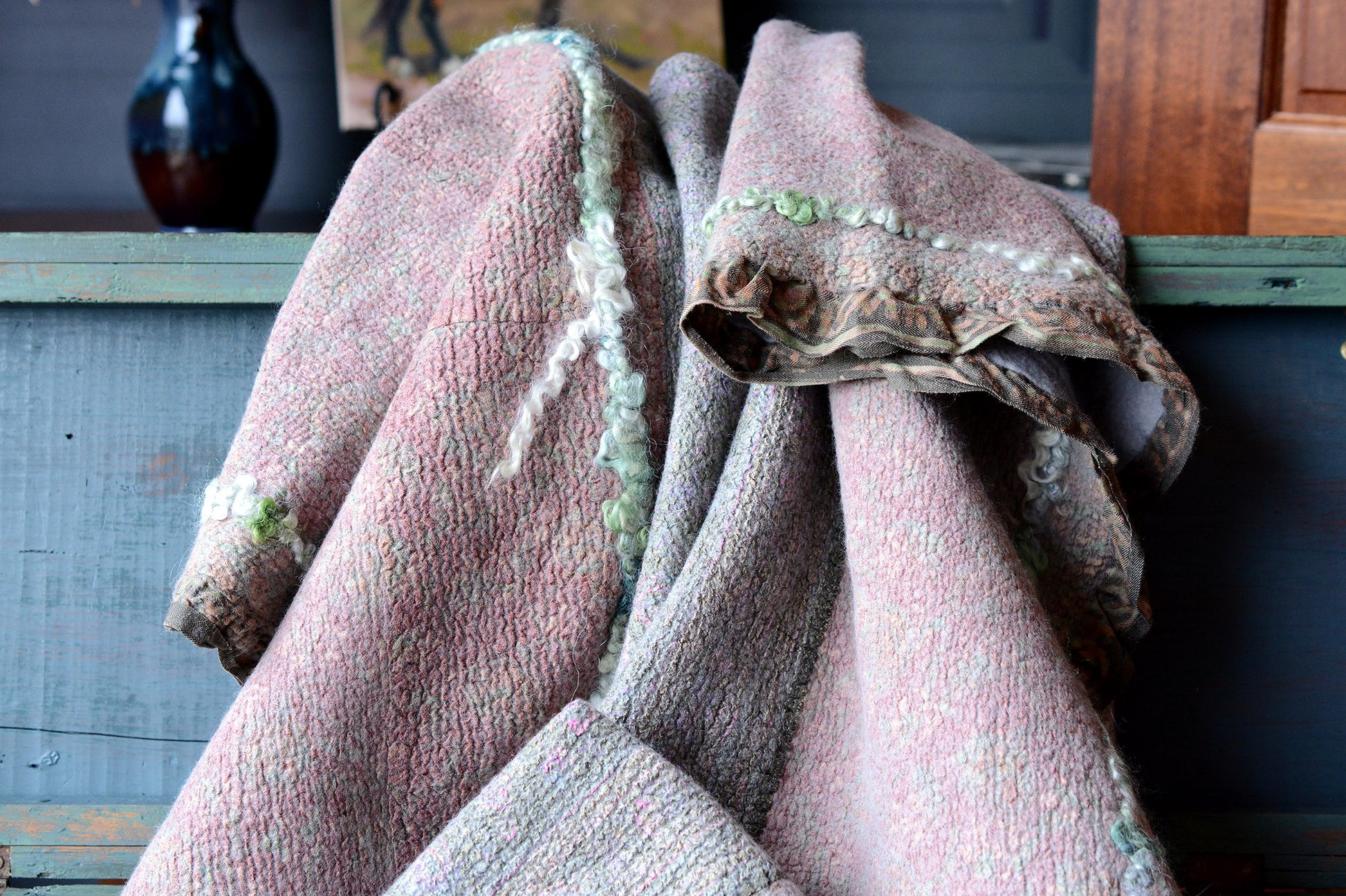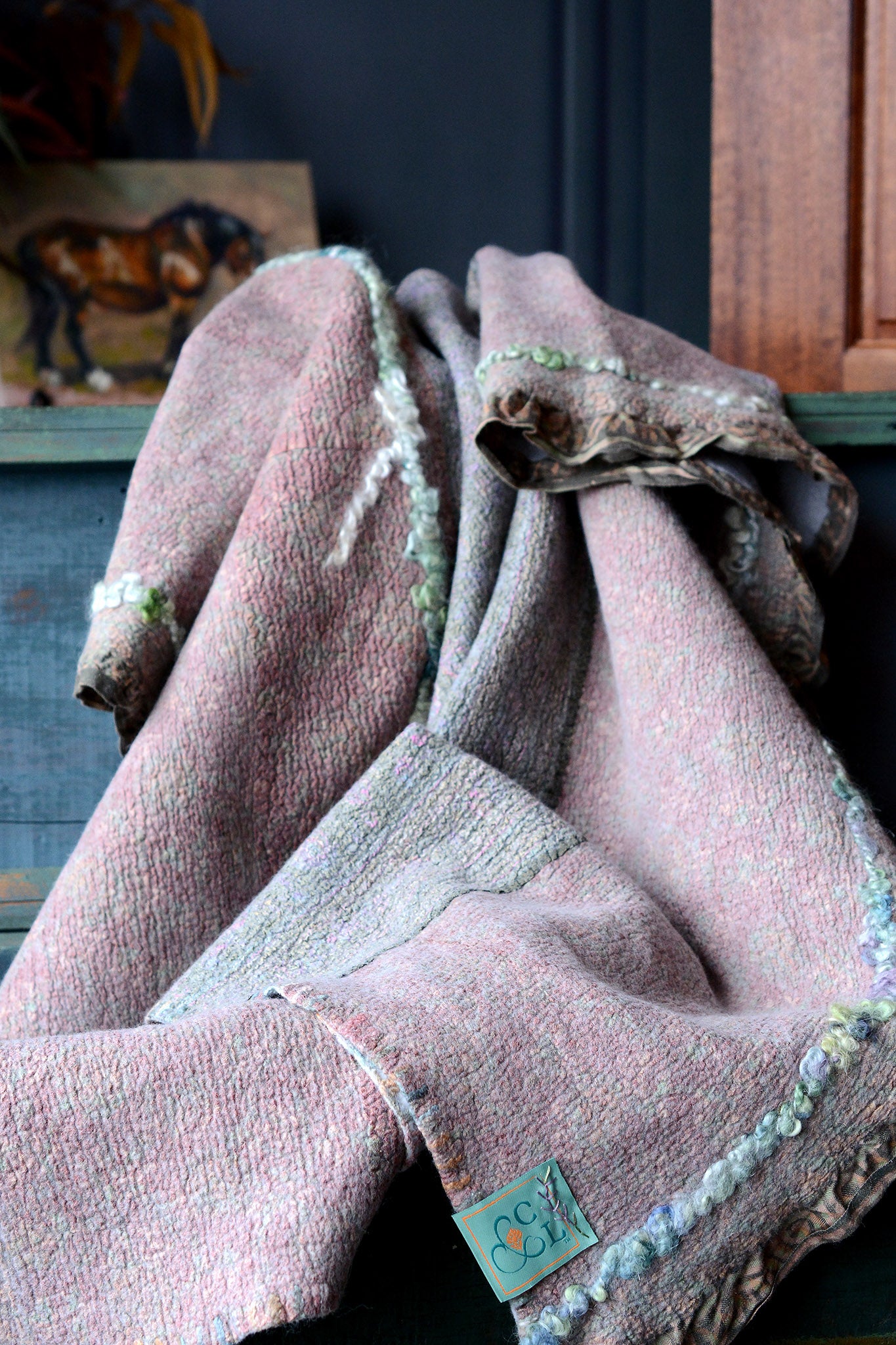 Cosset & Lock Silk and Wool Textiles are made using a unique process of felting to marry together the strength, beauty, and qualities of silk and wool natural fibers. Because I use repurposed sarees, and due to the handmade process, every blanket has unique characteristics and distinctive occurrences.