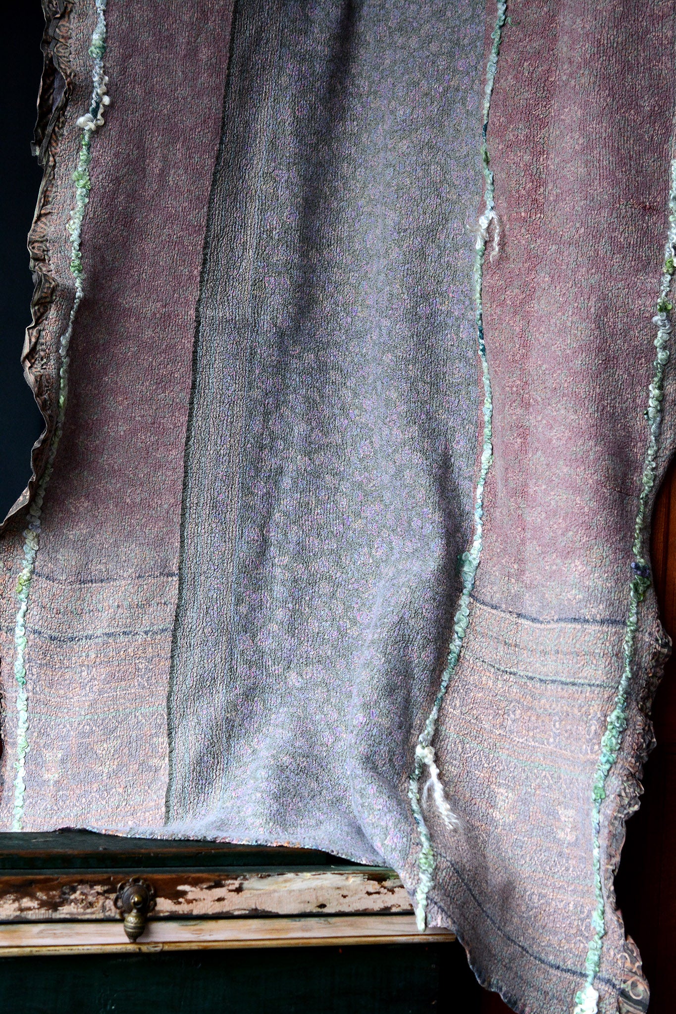 Made with woven fine wool saree and pure silk printed saree, Haven has a nice drape and heavier weight. It's locked together with a lively hand-spun lock yarn made by Sara. Ends are finished with Manos Del Uruguay silk and wool yarn and sides have ruffled edges of saree silk created by the felting process.