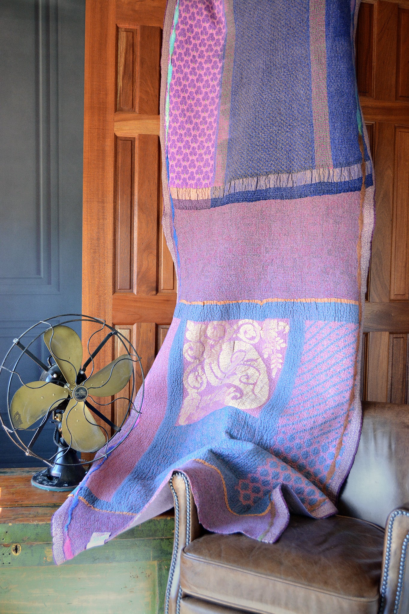 Horizon is a color blocked runner made with a variety of saree types on muted purple superfine merino wool felt with handspun thick and thin yarn.