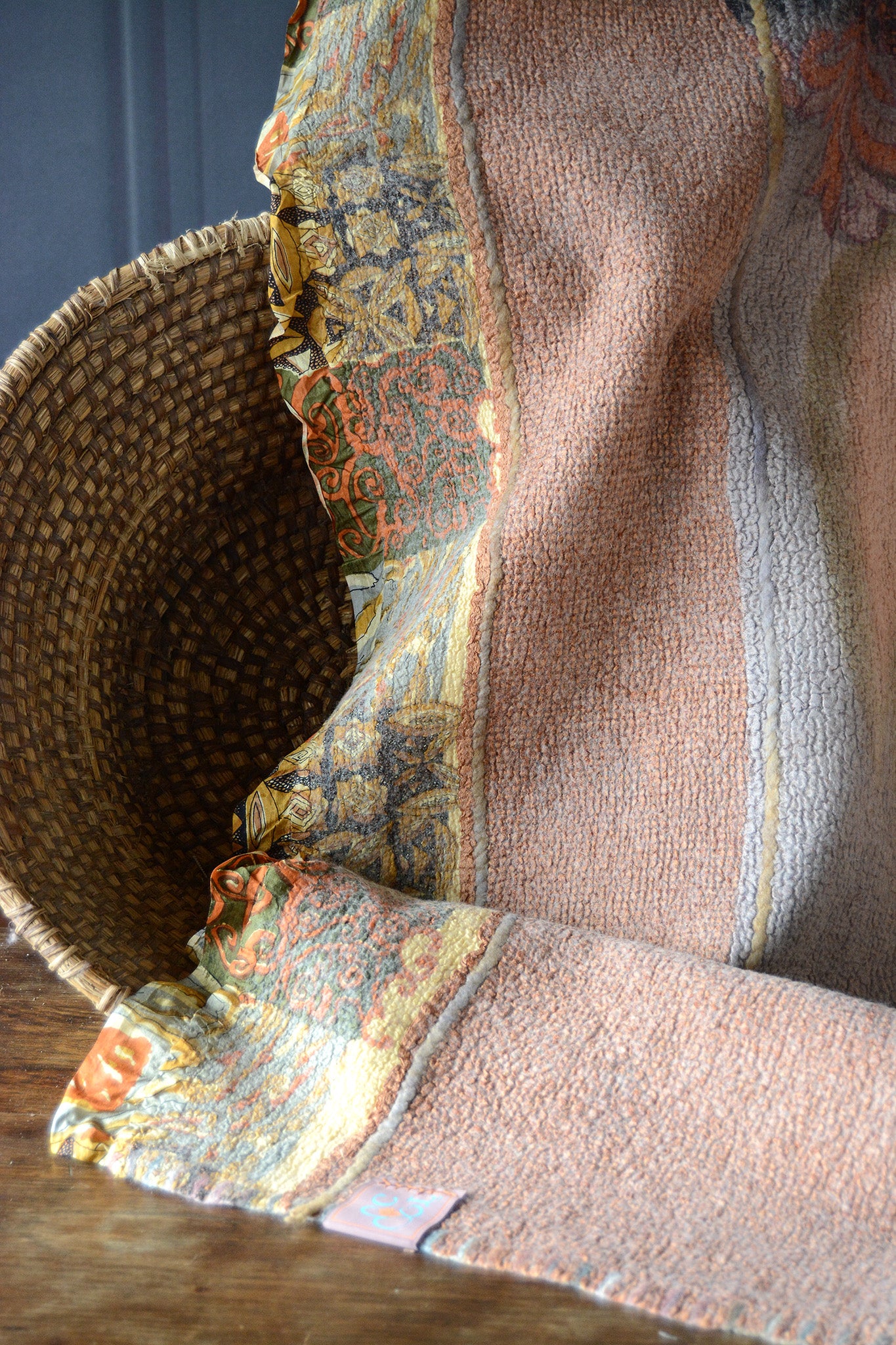 Cosset & Lock Silk and Wool Textiles are made using a unique process of felting to marry together the strength, beauty, and qualities of silk and wool natural fibers. Because I use repurposed sarees, and due to the handmade process, every blanket has unique characteristics and distinctive occurrences.