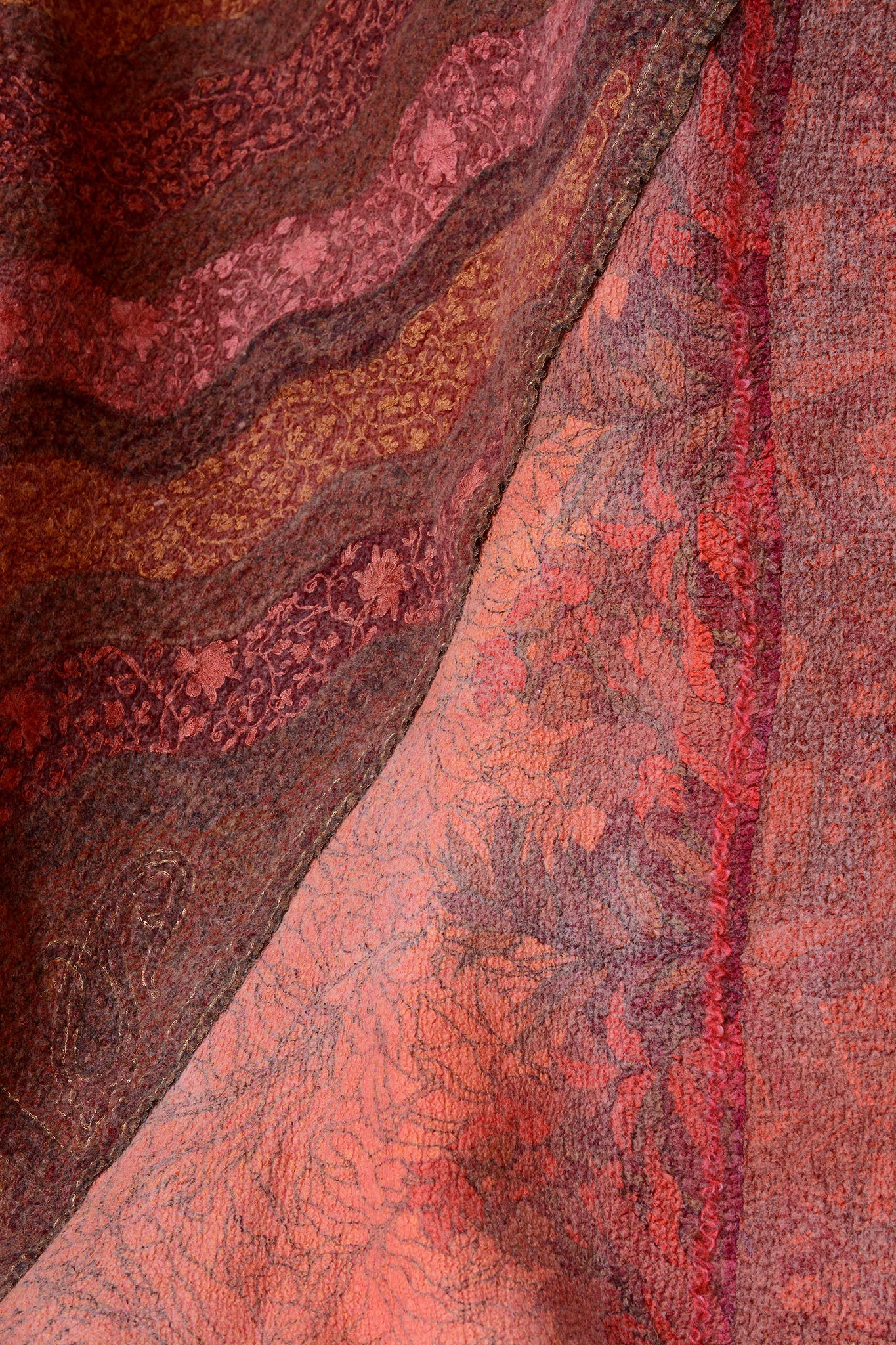 Rapt is a vision in color and texture and heavy weight because of the materials. It's made with 1/2 woven wool saree and 1/2 silk brocade saree with a full wool shawl and mohair handspun yarn. Ends are finished with Kilim Manos Del Uruguay silk and wool yarn and sides have ruffled edges of brocade saree silk created by the felting process.