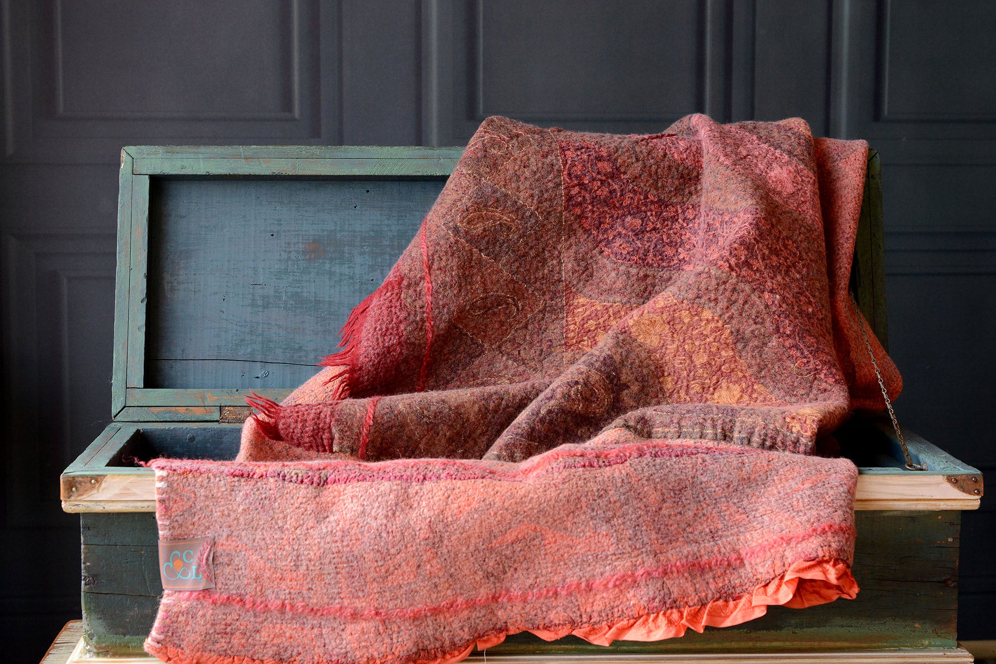 Cosset & Lock Silk and Wool Textiles are made using a unique process of felting to marry together the strength, beauty, and qualities of silk and wool natural fibers. Because I use repurposed sarees, and due to the handmade process, every blanket has unique characteristics and distinctive occurrences.