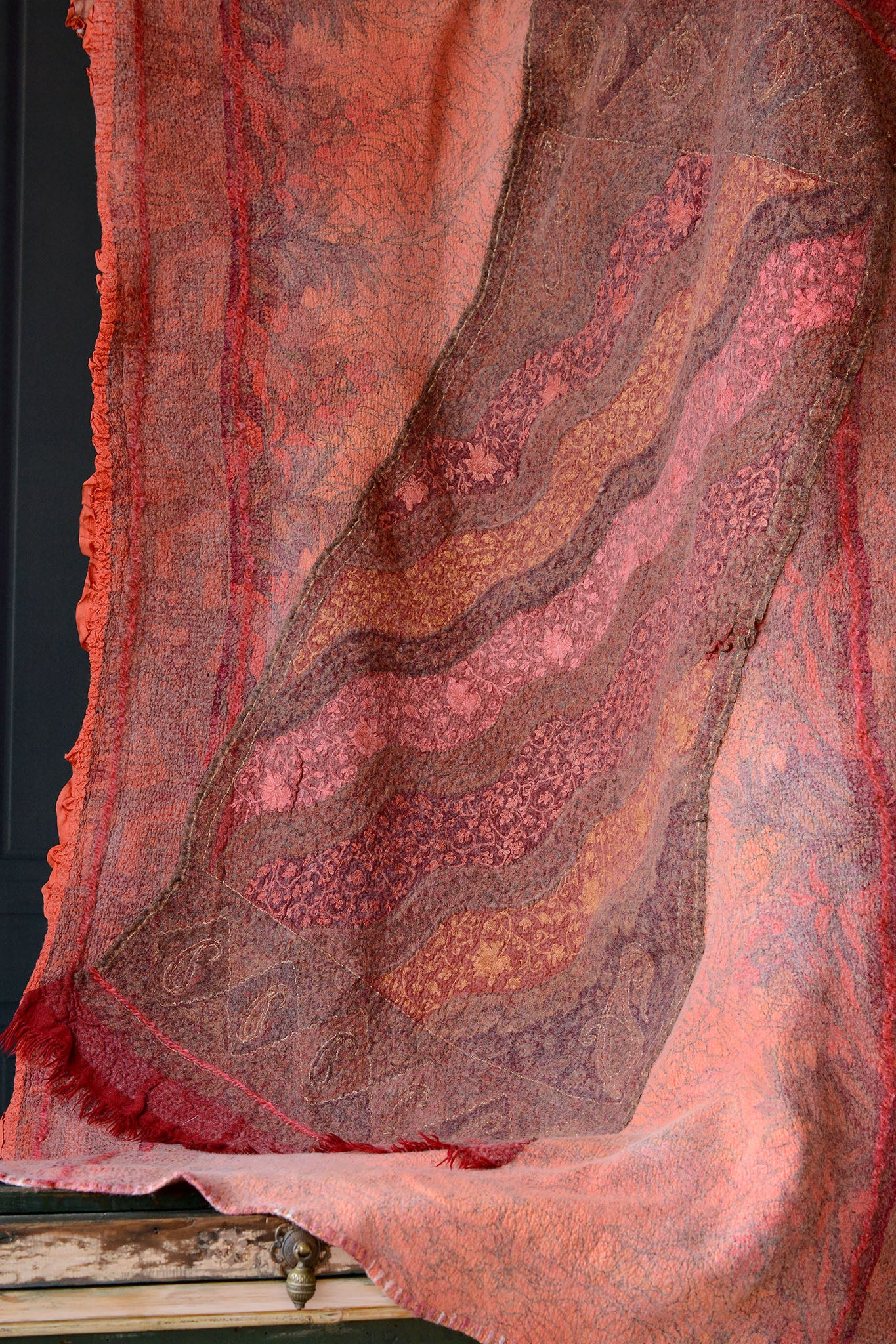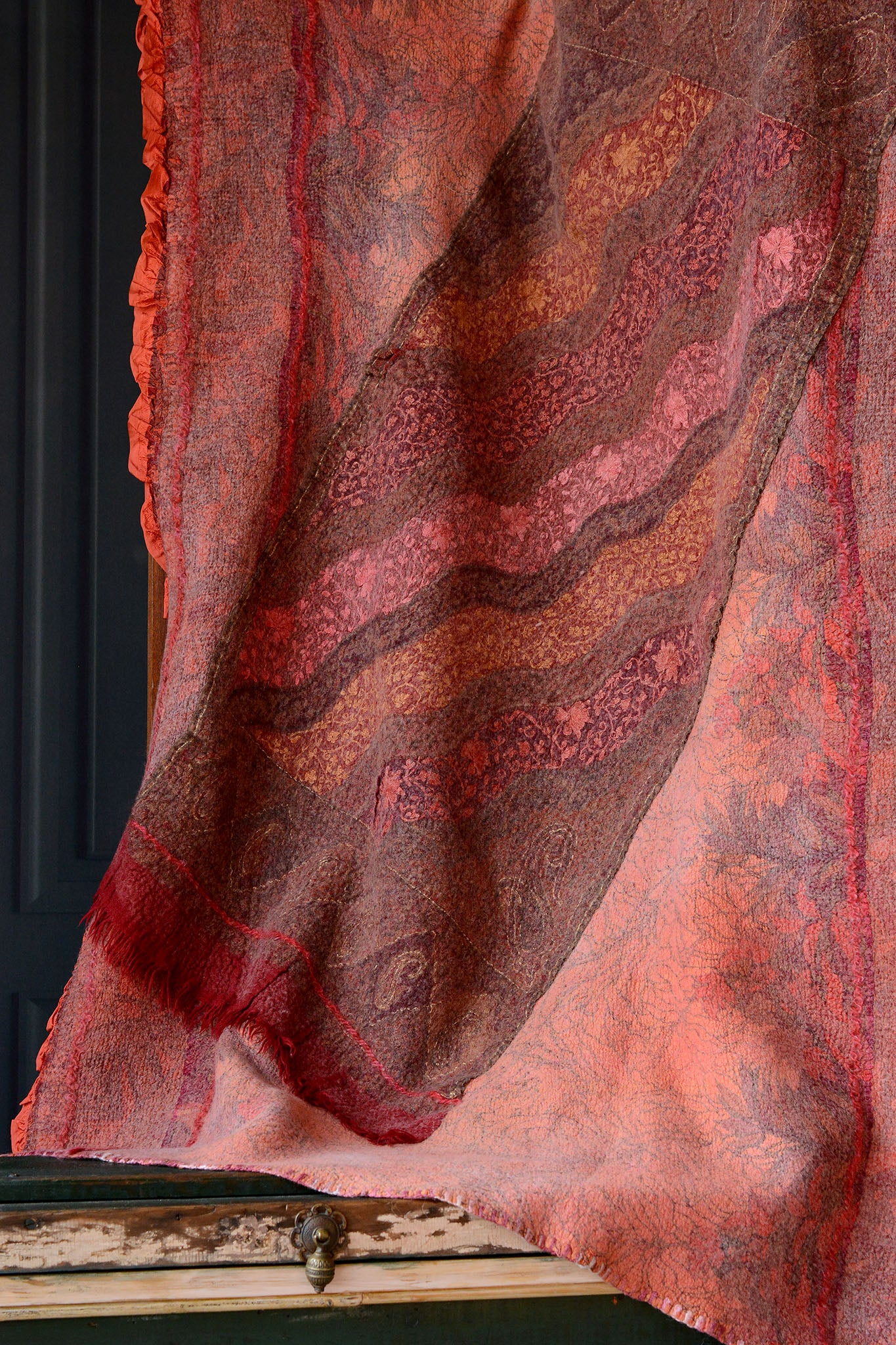 Measures 44 x 75" and is backed with hand dyed salmon colored merino wool.