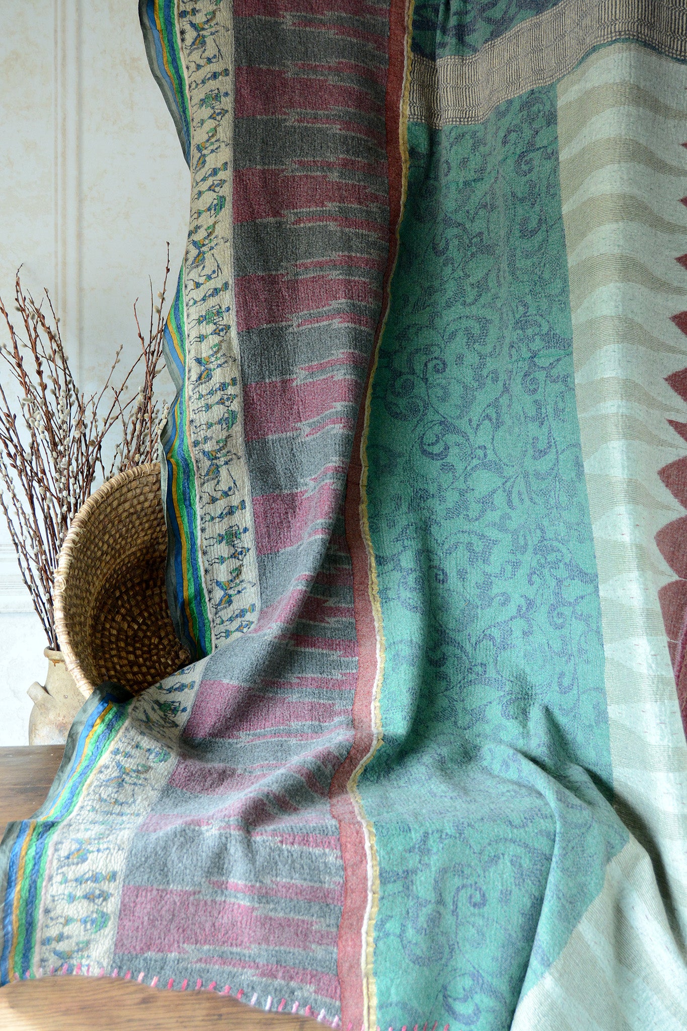 Voyager is made on a soft and thin naturally colored merino prefelt with woven wool and Ikat sarees, creating a large, soft, and draping throw big enough for two.