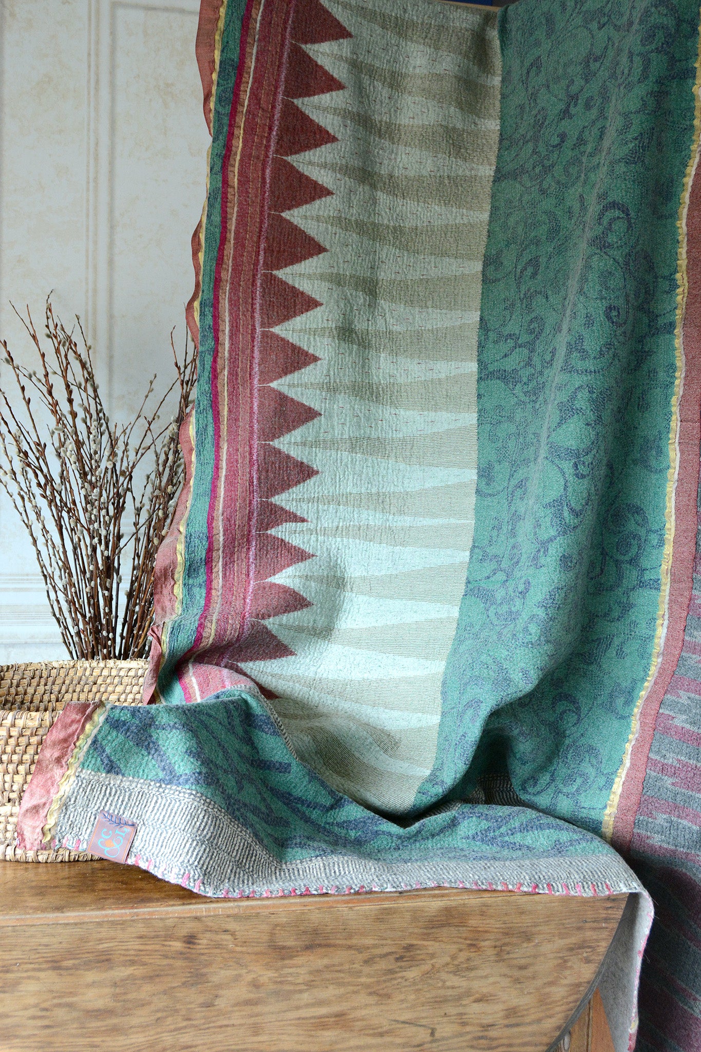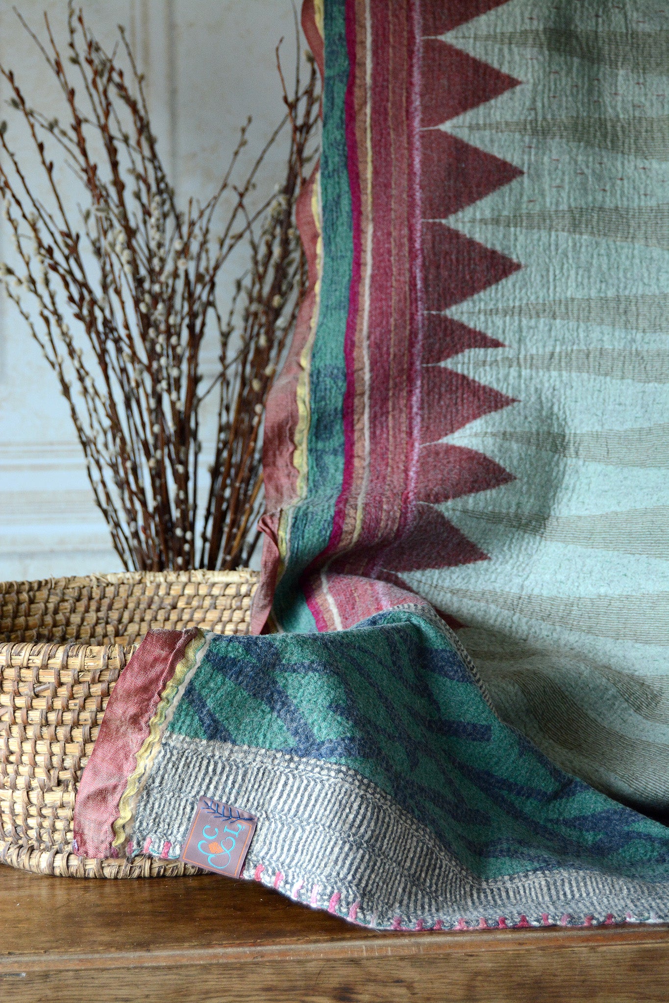 Cosset & Lock Silk and Wool Textiles are made using a unique process of felting to marry together the strength, beauty, and qualities of silk and wool natural fibers. Because I use repurposed sarees, and due to the handmade process, every blanket has unique characteristics and distinctive occurrences.